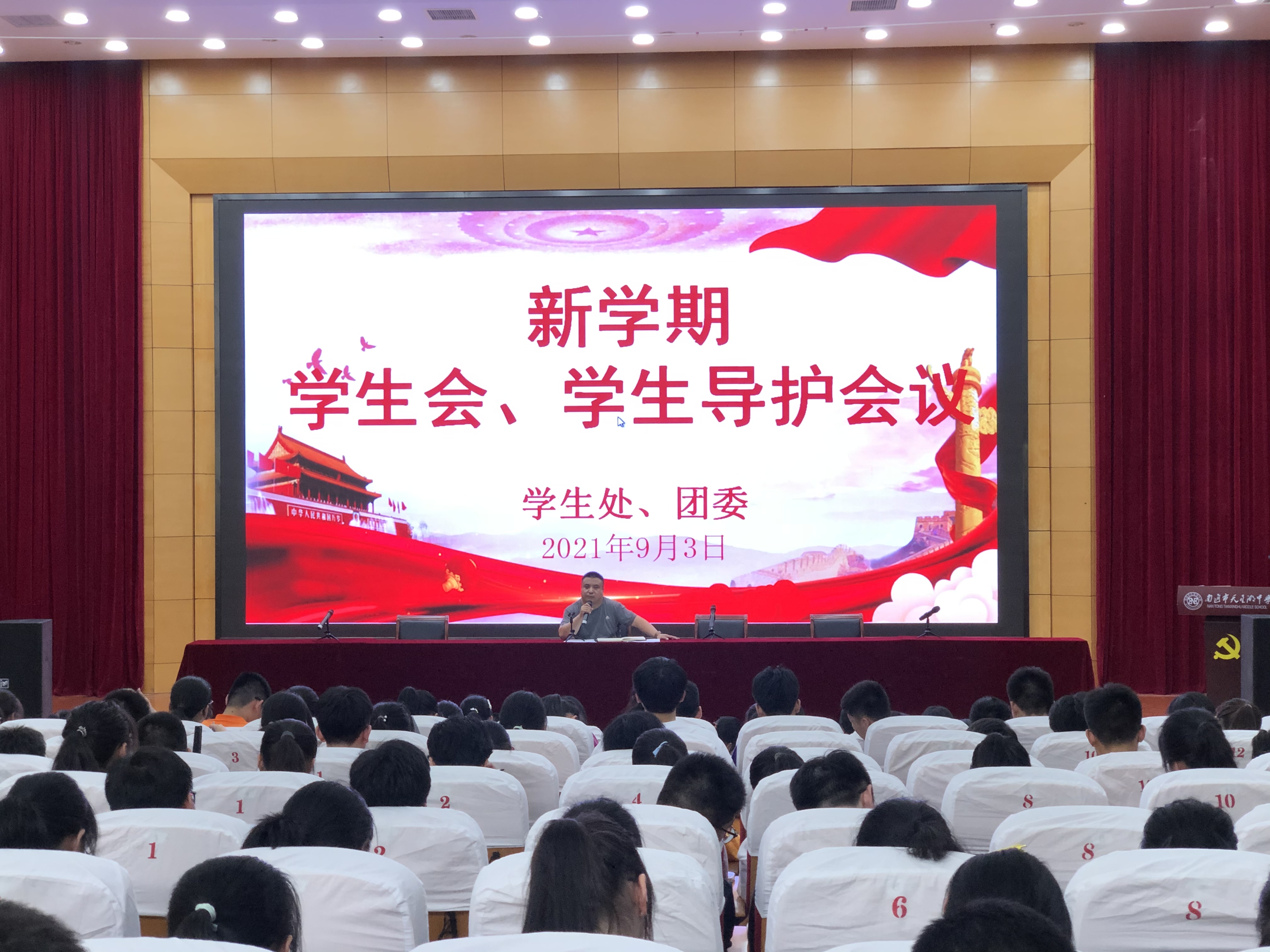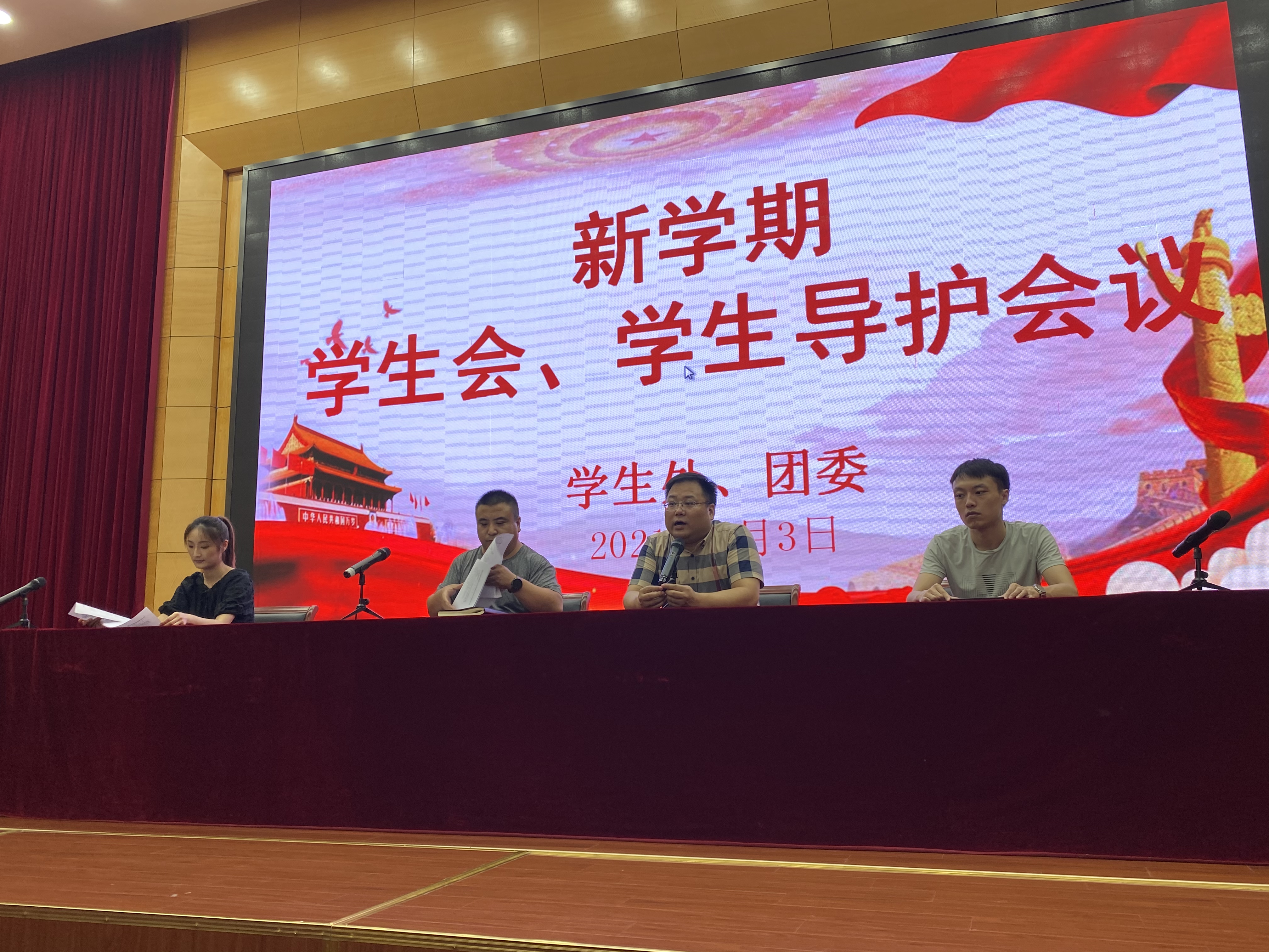 为加强学校的常规管理,培养学生的主人翁精神和民主监督意识,指导新学期学生工作顺利进行,我校学生处、团委两部门于9月3日中午在报告厅召开新学期工作会议,会议由团委书记沈亚威老师主持,学生处曹东华主任,团委委员张甜甜老师、陈桐老师,学生会全体成员以及各班主要班干参加会议。