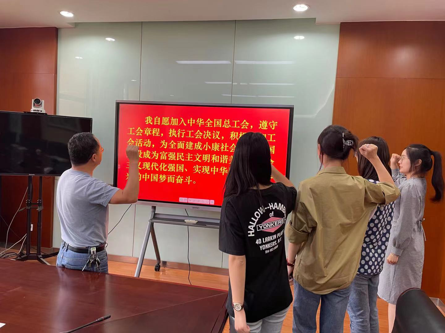 最后,四名新会员集中入会宣誓,校长办公室陈达主任领誓:我自愿加入中华全国总工会,遵守工会章程,执行工会决议,积极参加工会活动……