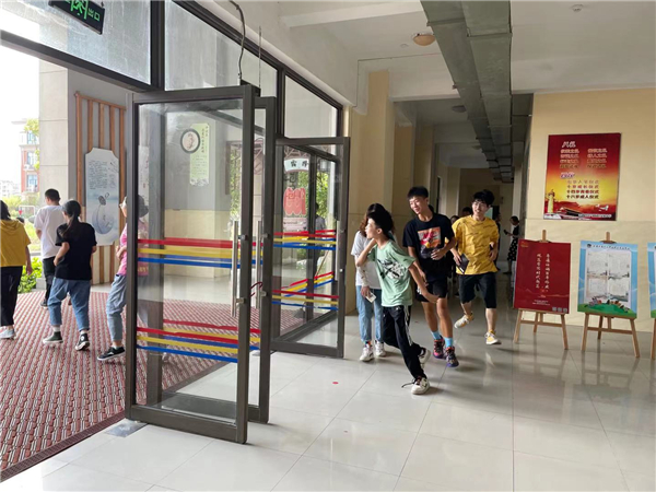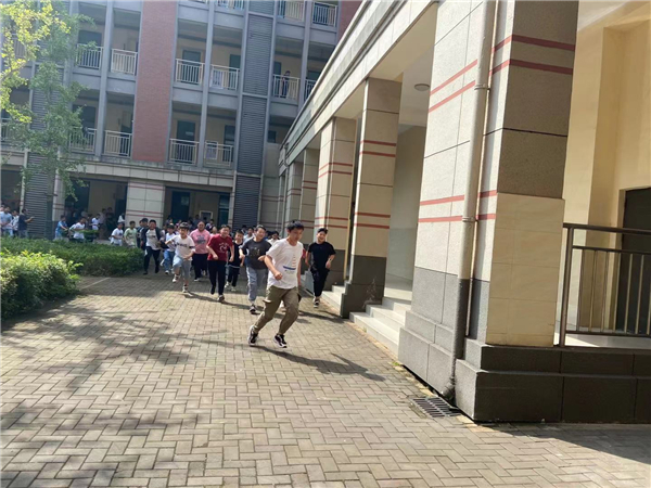 上午10点,随着防空警报的响起,各班学生在老师的指挥下按照指定的安全出口,迅速并有序地离开教学场所,紧急撤离到安全地带,全部学生在规定的时间内到达了安全地带。