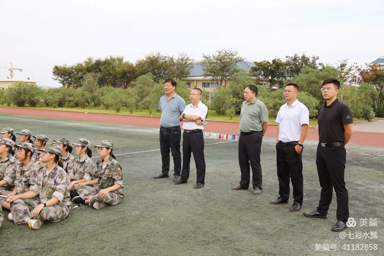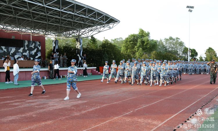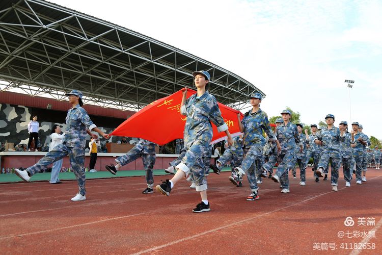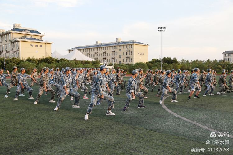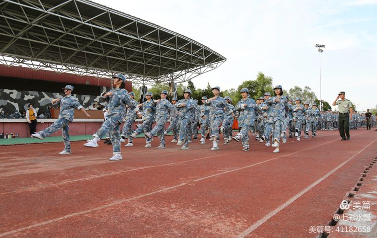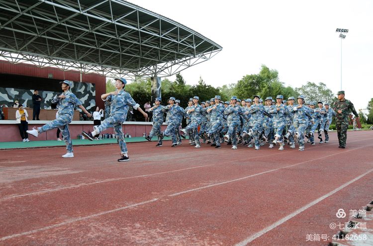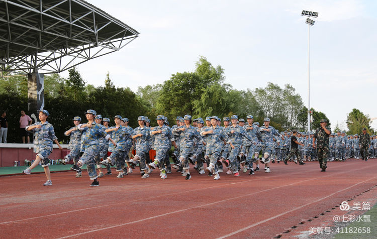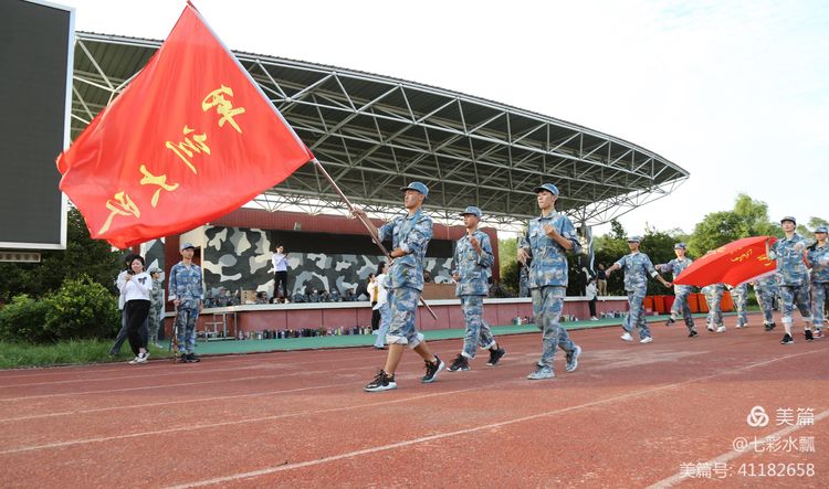 硝烟弥漫训练场,将士斗志比钢强。千军万马争向前,热血不尽誓不还。分列式训练正在紧张进行,学生个个意气风发,斗志昂扬。