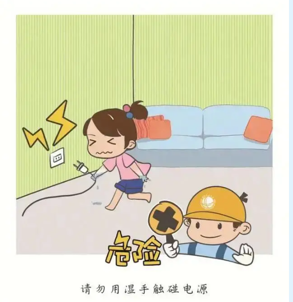 (2)教育孩子不要乱动、乱接电线、灯头、插座,不用湿手或湿布触碰家用电器,同时指导孩子学会正确使用家用电器。