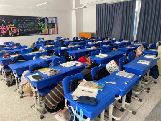 上午10点,空袭预警响起,防空演练正式开始。教师立即组织学生最快速度躲避到安全区域,引导学生迅速躲在桌子下,椅子后,降低身体重心,尽量蜷曲身体,尽可能保护头部。