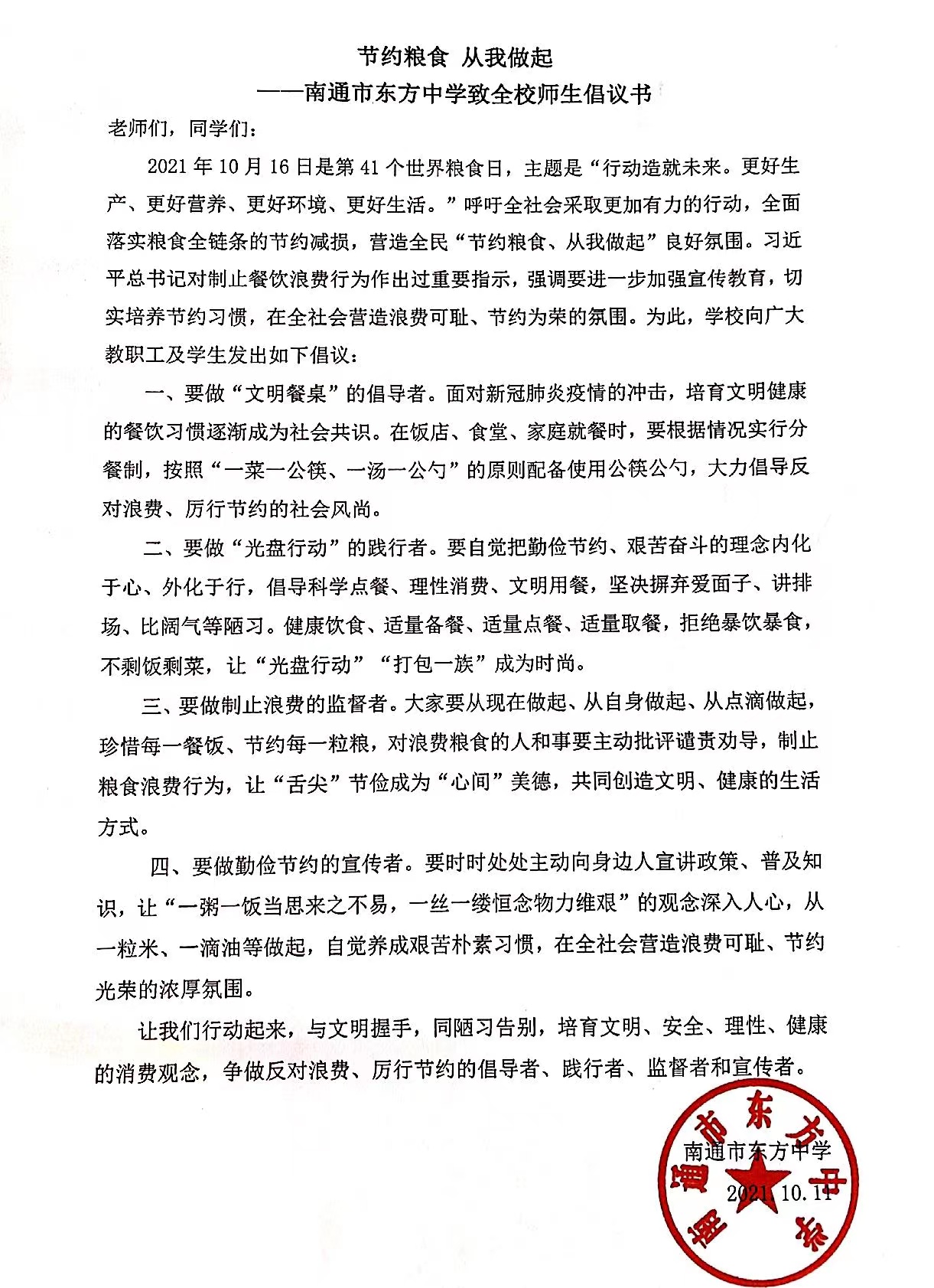 【润心德育·多彩生活】节约粮食 从我做起——南通市东方中学致全校师生倡议书