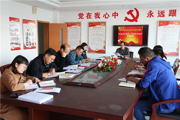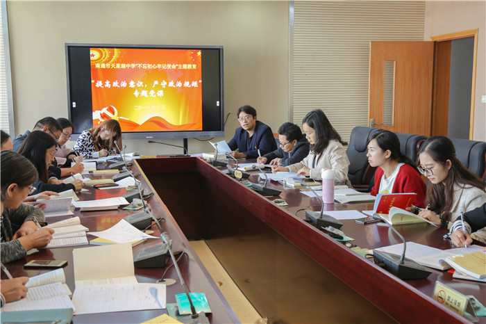 天星湖中学党委班子在认真学习及调研的基础上扎实推进专题党课学习:10月30日上午在党员活动室学校党委书记徐新民同志给党委中心组成员做了“提高政治意识 严守政治规矩”为主题的专题党课,紧跟学校党委步伐,10月31日中午三个支部围绕主题分别进行党课学习,党委副书记葛红军同志在党员活动室给行政后勤支部做党课培训,副校长耿建同志在滋兰楼六楼中会议室给理科支部做党课培训,纪委书记陈卫东同志在滋兰楼六楼西会议室给文科支部做党课培训。