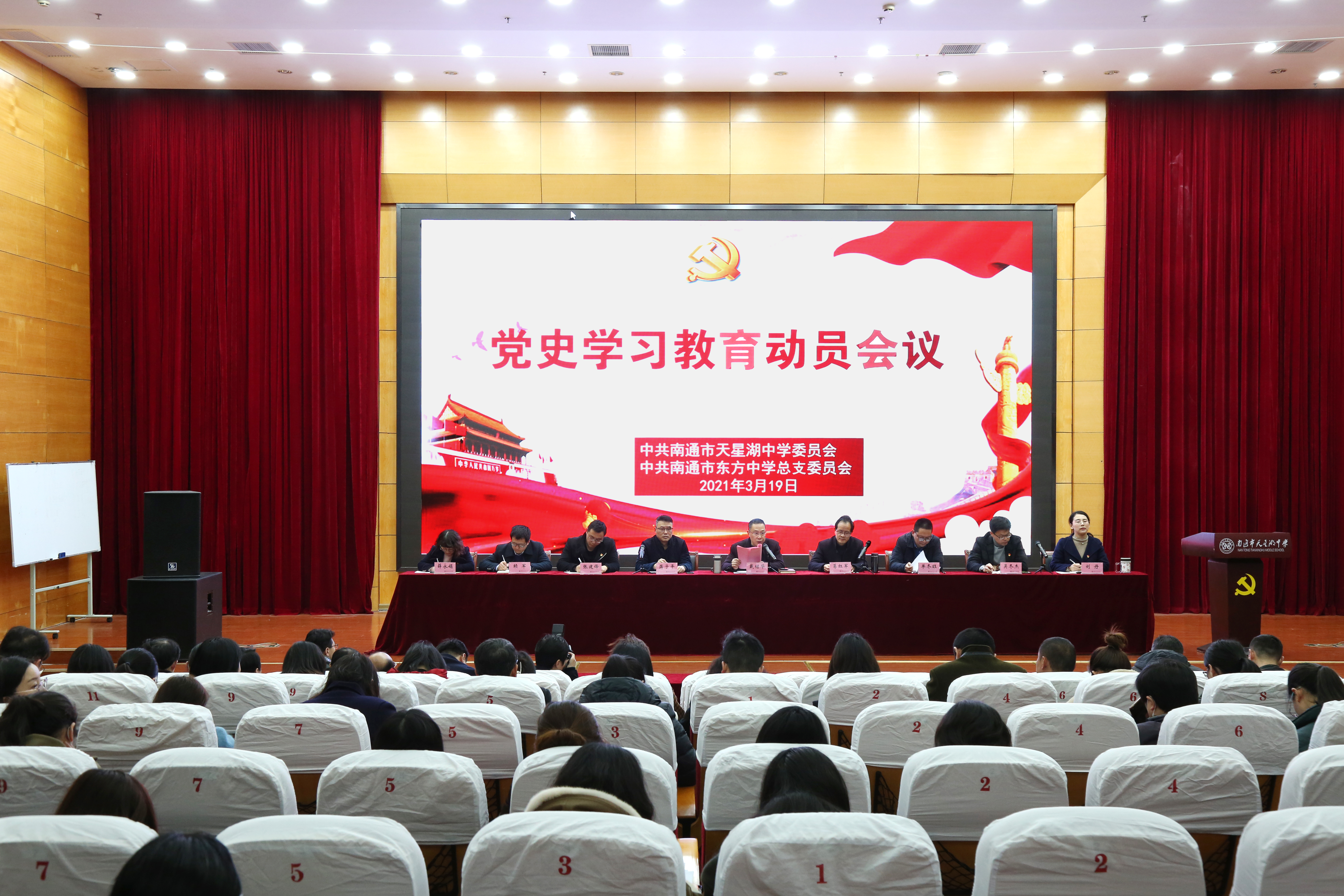 2021319日下午,南通市天星湖中学、南通市东方中学党史学习教育动员会议在天星湖中学滋兰楼报告厅召开。会议对两校开展党史学习教育作出全面部署,进行全面动员。两校全体党员参加会议。