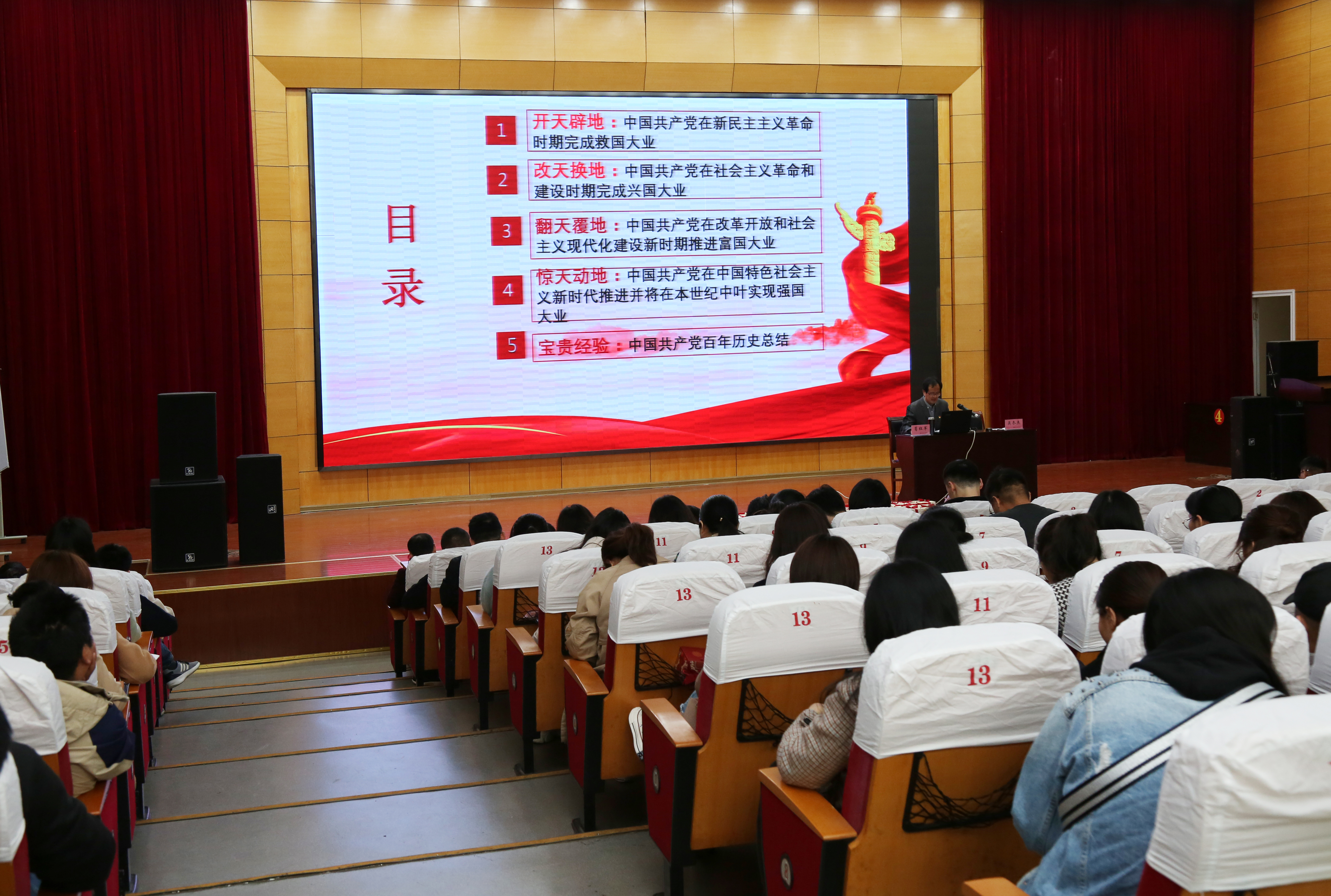 首先,学校党委副书记、纪委书记葛红军同志为全体教职工作“党史学习教育”——《中国共产党百年辉煌》专题讲座。葛书记从我党四个历史时期切入,全面回顾了铸就中国共产党百年辉煌的四件大事:开天辟地——中国共产党在新民主主义革命时期完成救国大业;改天换地:中国共产党在社会主义革命和建设时期完成兴国大业;翻天覆地——中国共产党在改革开放和社会主义现代化建设新时期推进富国大业;惊天动地——中国共产党在中国特色社会主义新时代推进并将在本世纪中叶实现强国大业。讲座对我党百年历史做了总结,总结了我党十三点宝贵经验。
