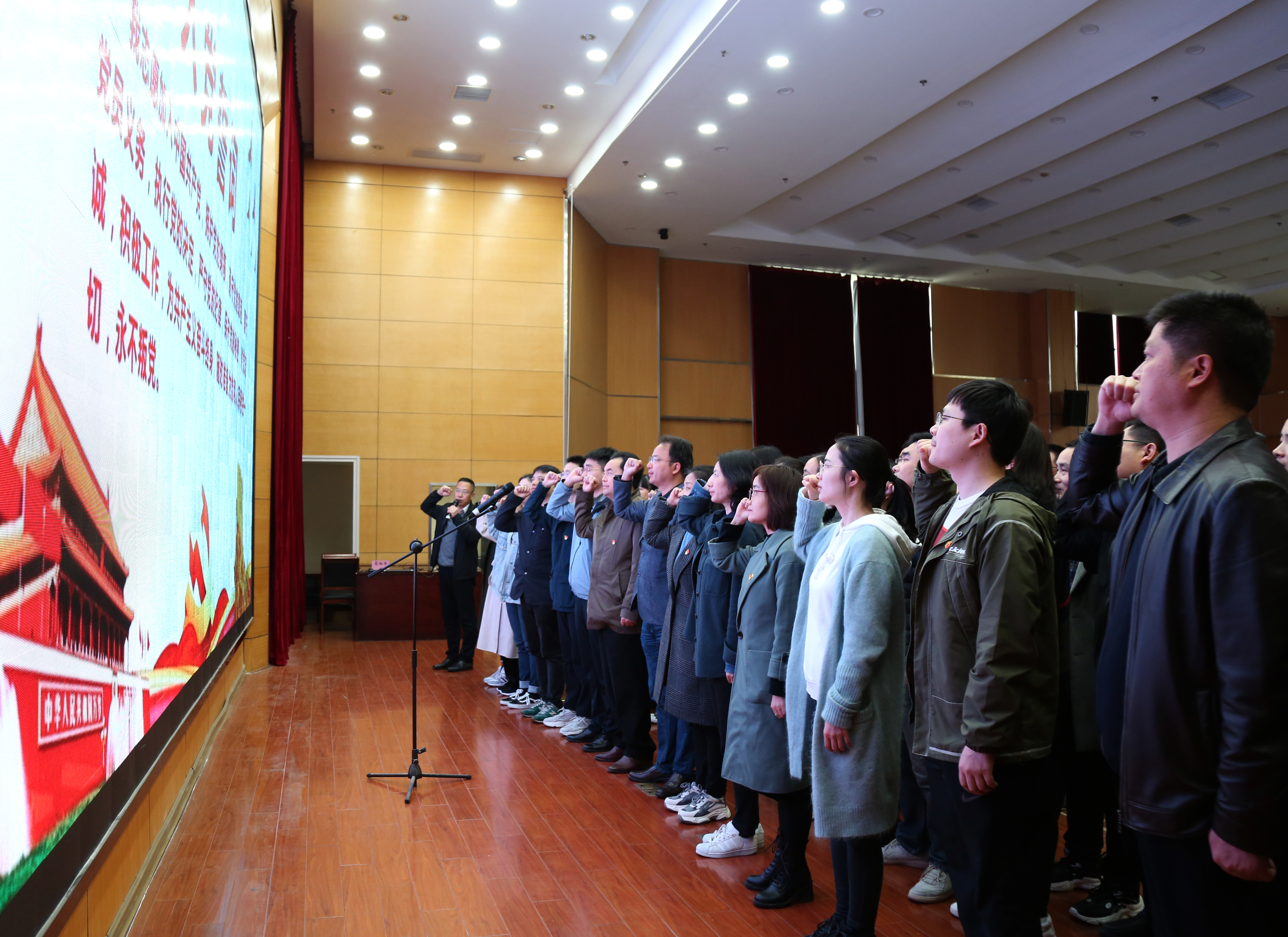 第二项议程是重温入党誓词。所有党员同志在学校党委书记、校长戴继华同志领誓下,面向党旗,共举右手,重温入党誓言,不忘初心,牢记使命。
