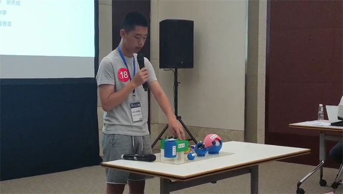 在15分钟的实物作品展示、现场答辩、专家提问环节,每一个参赛队都呈现出最闪亮的一面,各显千秋。这是一个所有观众视听、当场亮分的环节。黄亿禾同学流畅地陈述了他的作品创作思路和过程,并演示了他的实物作品,得到现场评委和观众的一致好评。