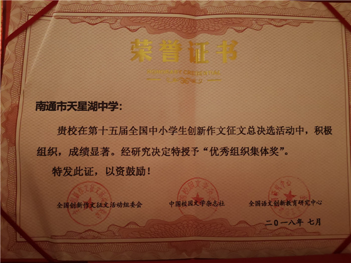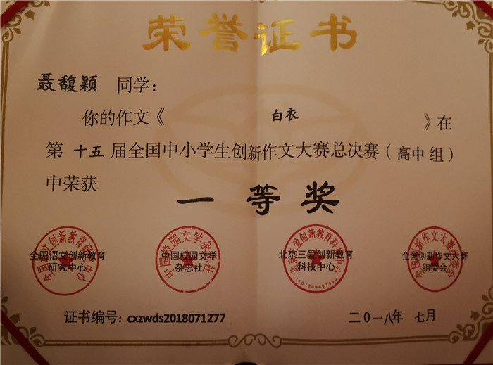 7月29日,捷报传来,在第十五届全国中小学生创新作文大赛现场决赛中,我校学生再创佳绩。其中聂馥颖同学斩获国家级一等奖,王梓蔚、黄栋篪、王家玮等8位同学获国家级二等奖,丁子嫣、丁嘉怡、王淑娴等21位同学获国家级三等奖。