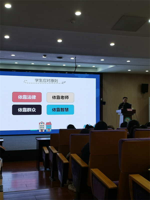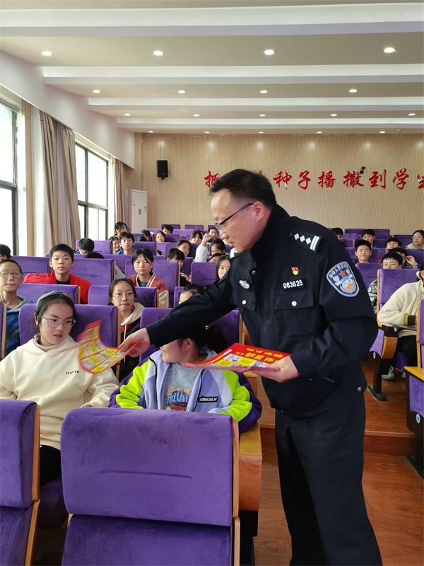 法治副校长李所长从预防未成年人犯罪、反校园暴力、消防安全知识、反诈骗四个方面为同学们带来了充实的法律知识。一个个鲜活的例子、惨痛的教训,警醒着在座所有的人;一条条机智的方法、生动的案例,教会了同学们如何在紧急情况下正确处理问题;一句句消防安全的提醒、防范诈骗的叮咛,深深地烙印在了孩子们心田……深入浅出的讲解让在场学生受益匪浅。同学们时而为风趣的讲解鼓掌,时而对违法犯罪的惨痛后果陷入沉思,时而埋头记录下相关的法律知识……李所长亲自为同学们分发了防诈骗宣传单,希望通过家校协作,让每个家庭都能提高防诈骗意识。