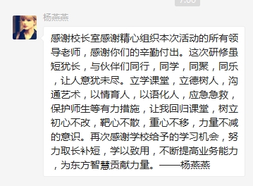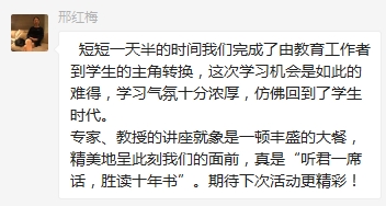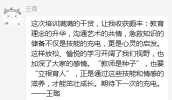 活动最后,郭校长在结班仪式上致辞,并给老师们做了题为《老师也是种子》的讲座,将眼光、注意力适当地投放在老师们的身上,关注到教师的发展需要、发展潜能,指出教师的成长才能带动学生的成长,最终实现教育的目的。郭校长的真情发言唤起了老师们的情感共鸣,获得了在场教师们的认同。