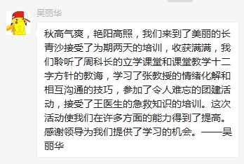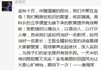 红枫经霜醉婆娑,回眸最是情义多。长青沙岛勤求索,路漫漫兮待磨琢。教育之行,始于足下,为助力我校教师的各项成长,帮助教师们寻获科学的方式梳理自身及学生的心理状态,从而获得职业的认同感和幸福感,在诗意的秋季,我校教科室牵头,选择在风景秀丽的长青沙岛风景区组织了一次以“深耕立学,助力成长”为主题的教师封闭式培训,力图通过教育学、心理学的培训,团建拓展活动的辅助,使得教师们一扫心理的尘埃,皆能在这个收获的季节不负韶华。