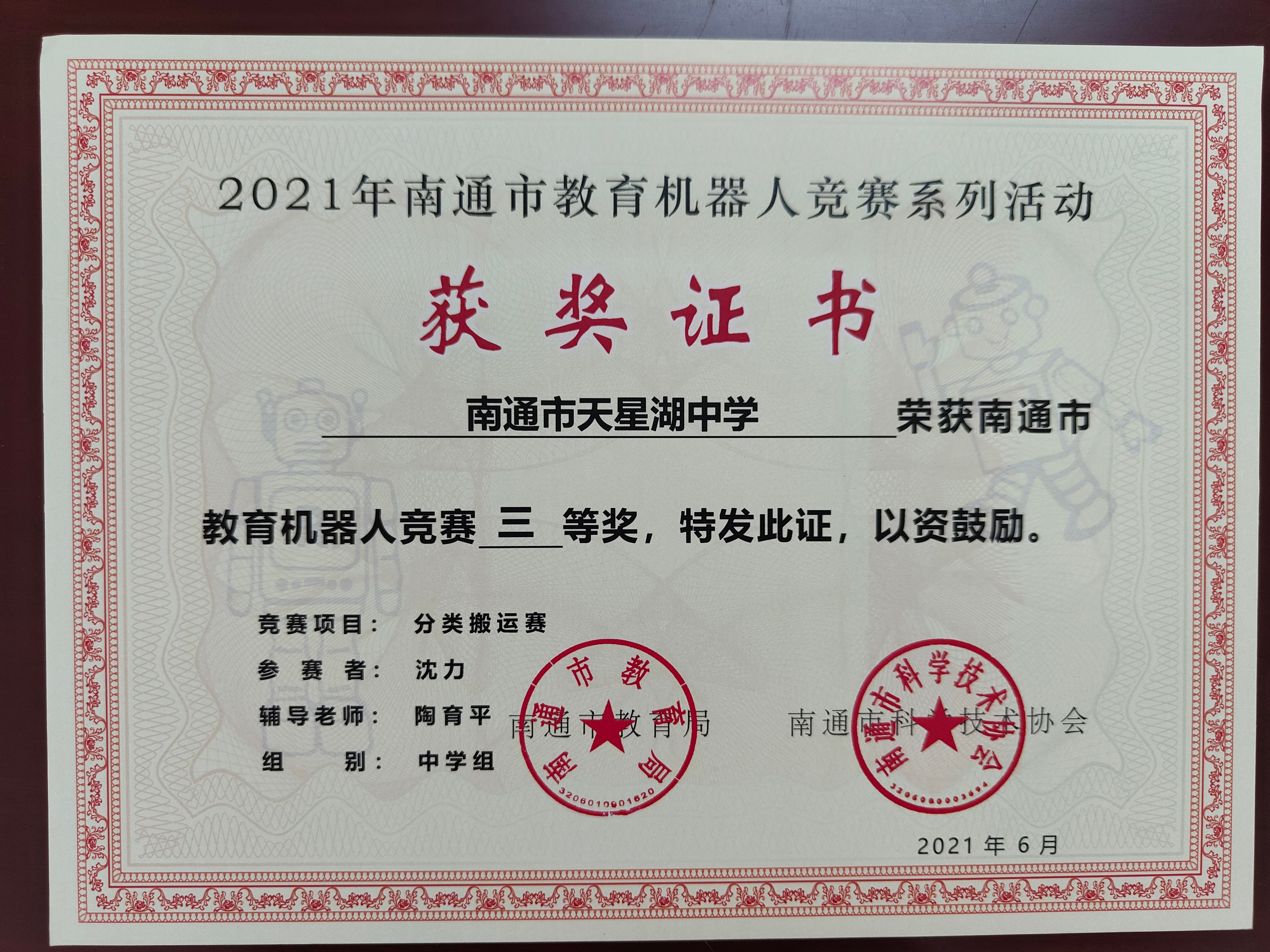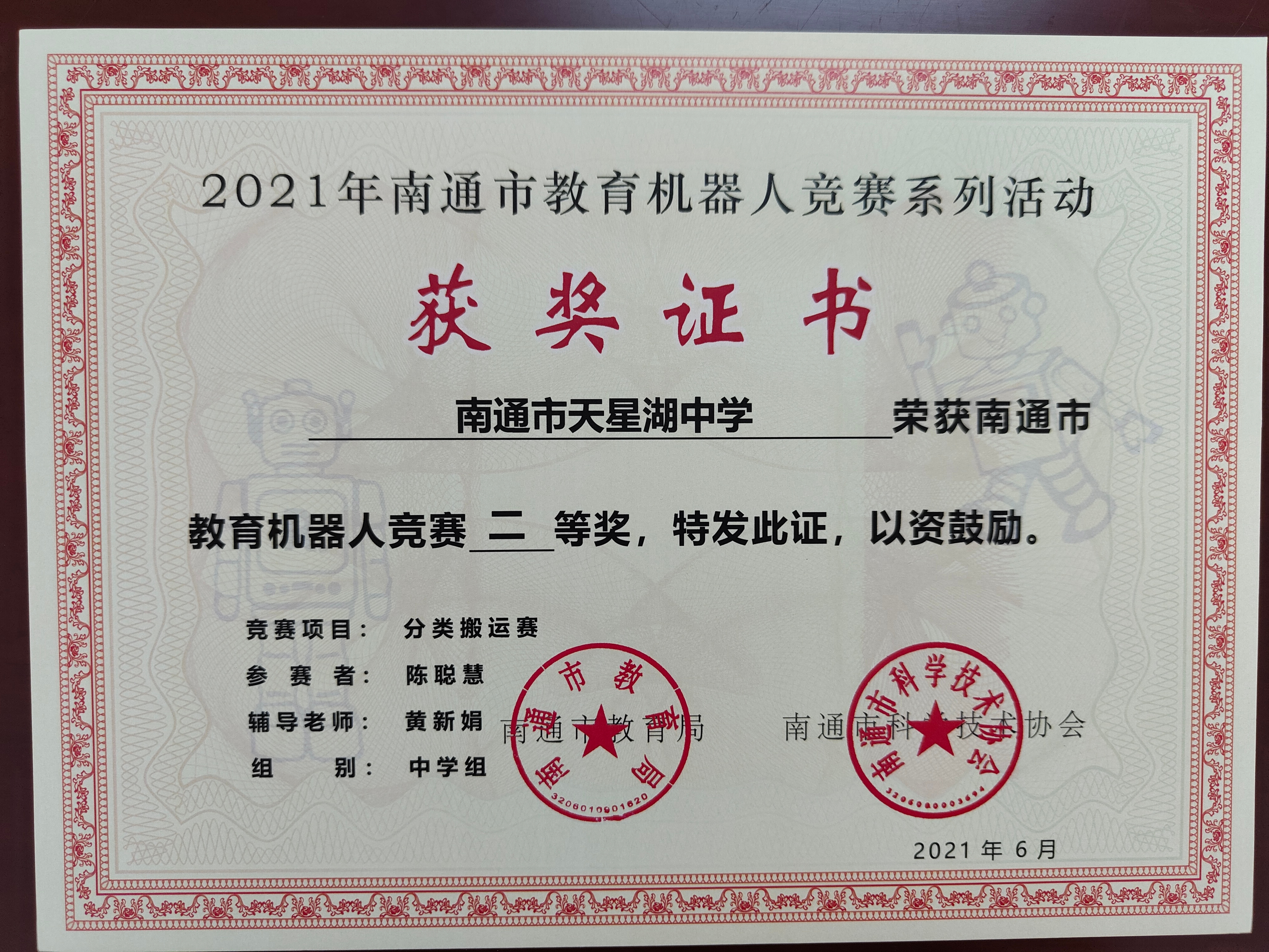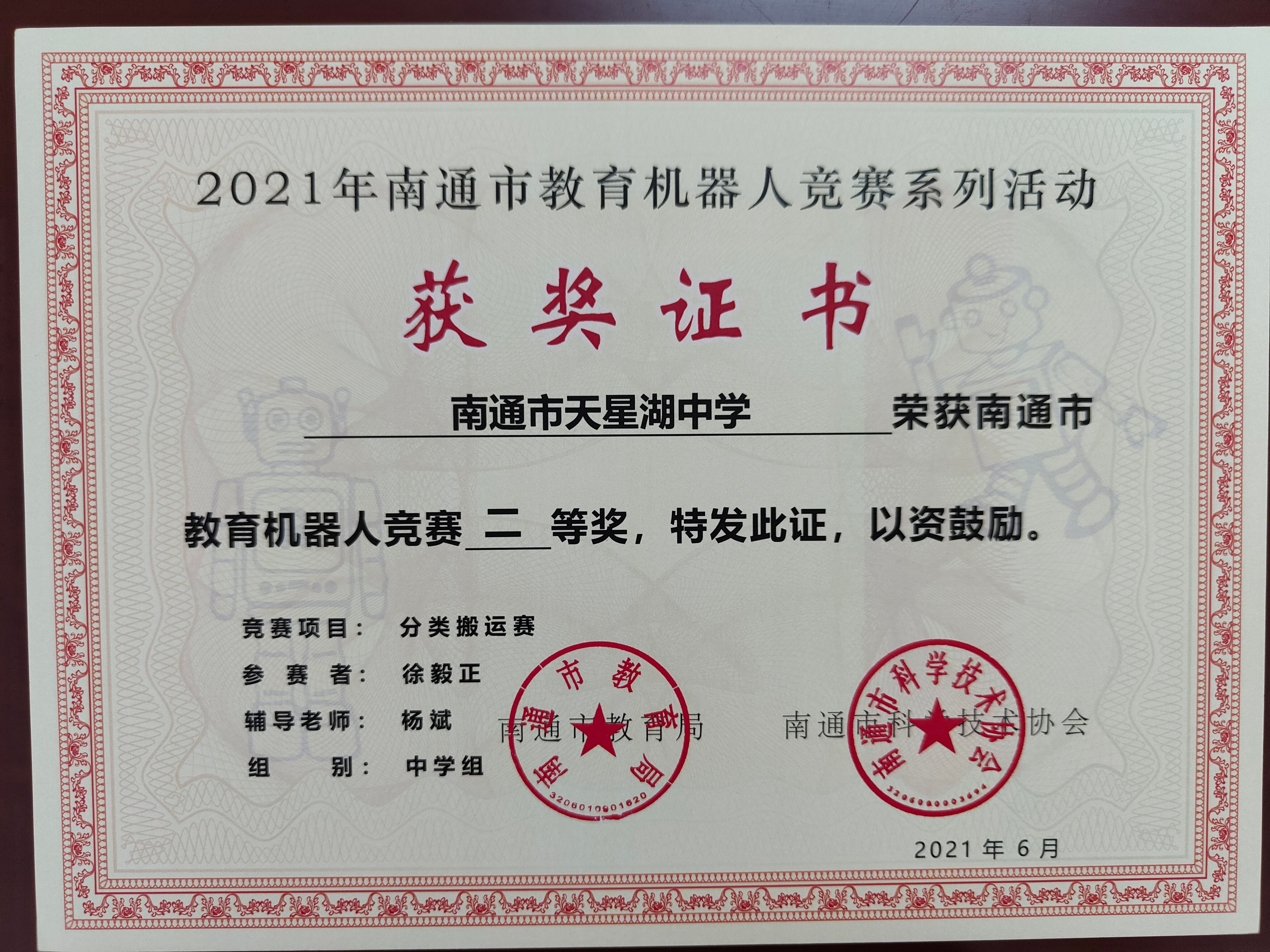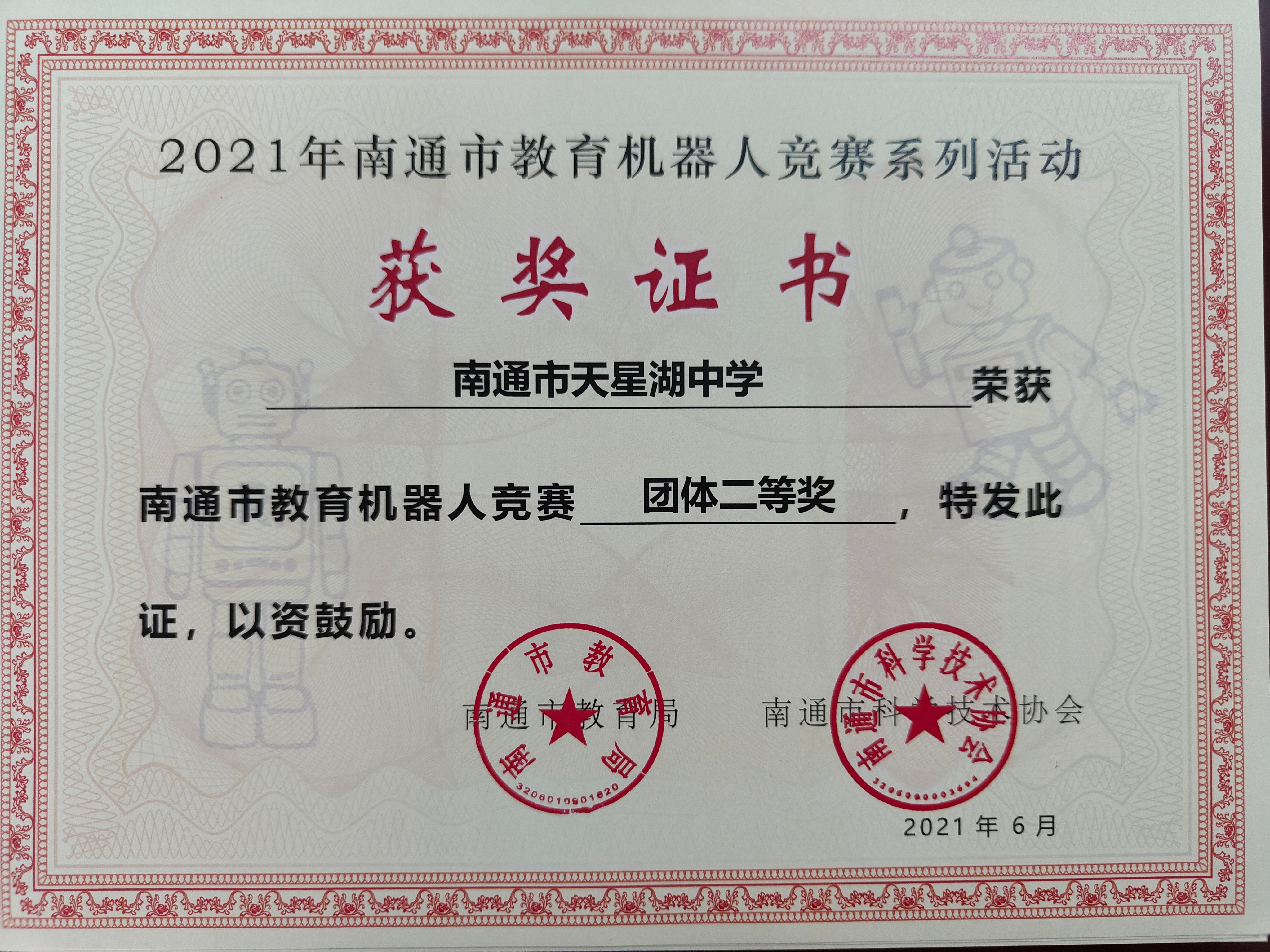 最终,在师生的共同努力下,我校获南通市教育机器人竞赛团体二等奖。