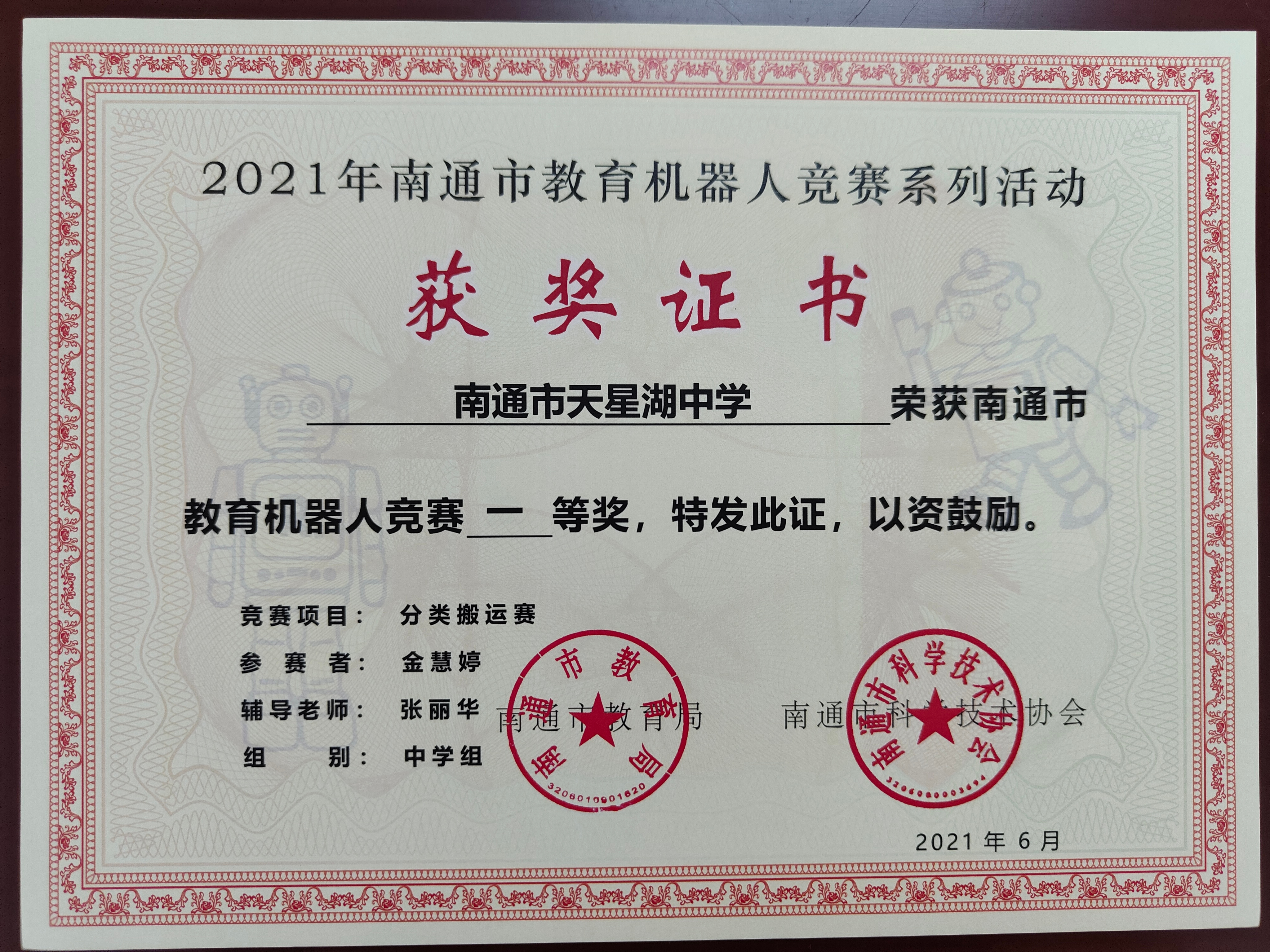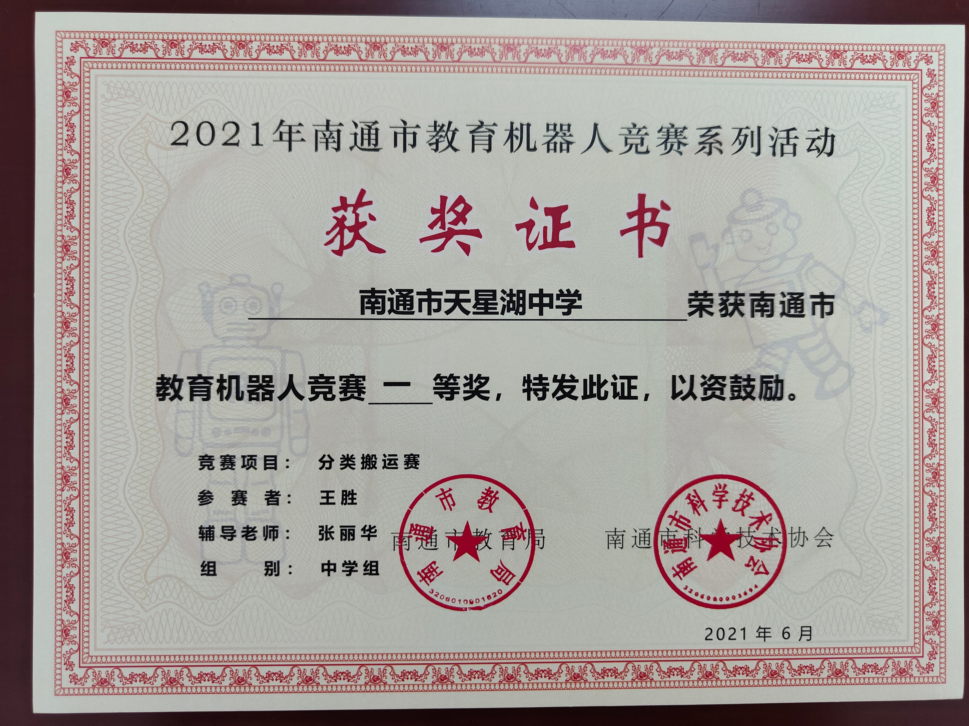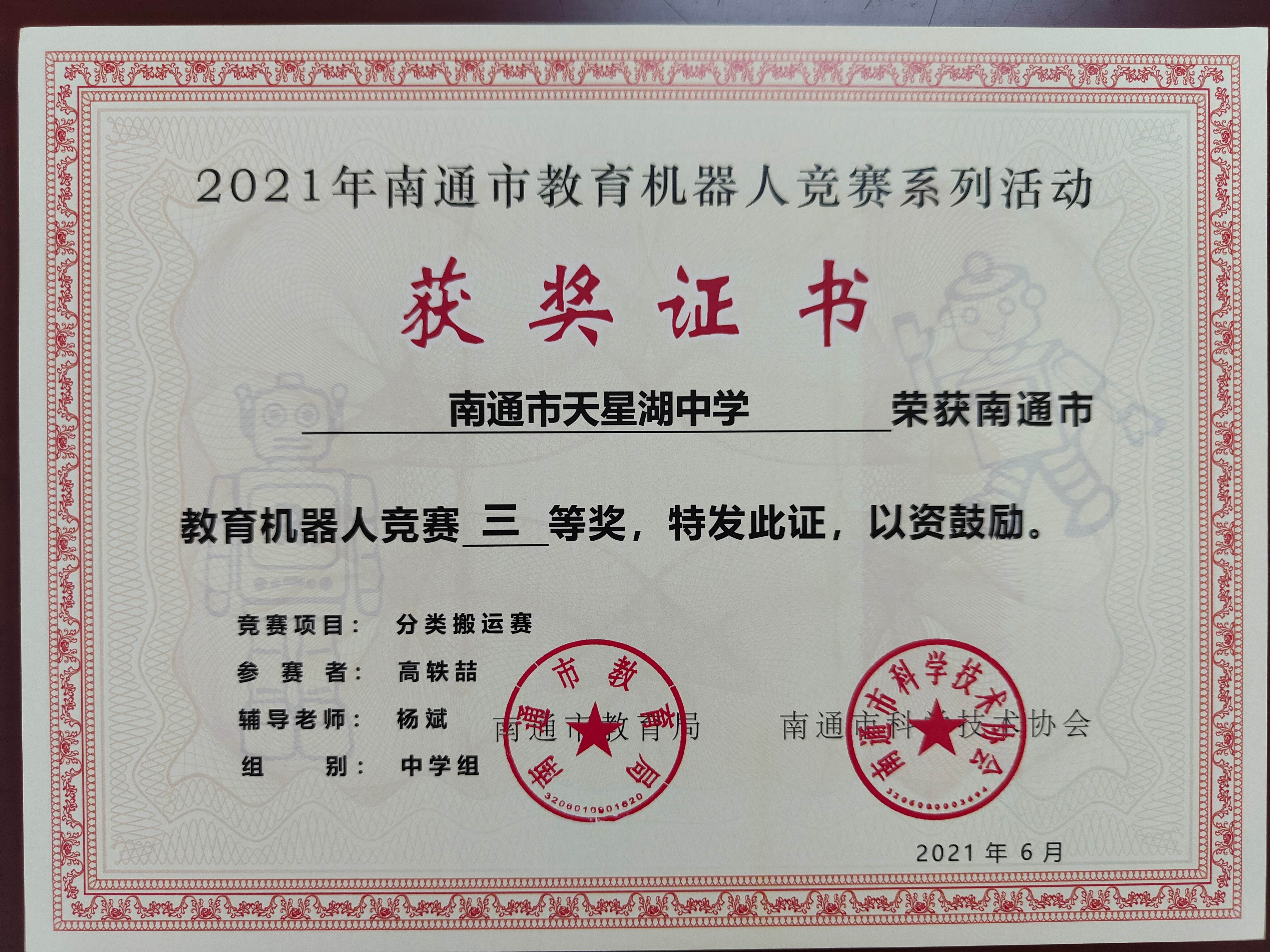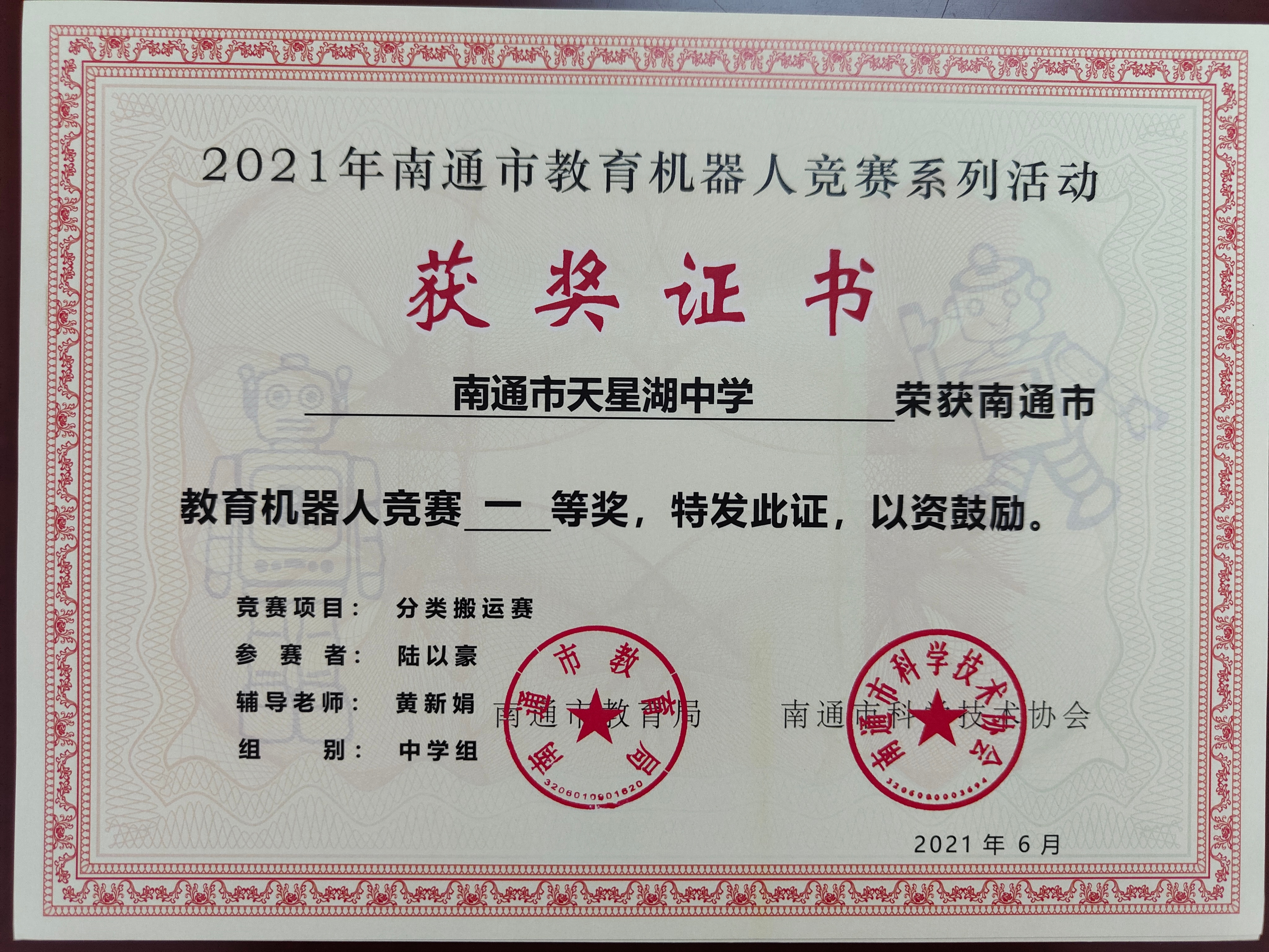 最终,在师生的共同努力下,我校获南通市教育机器人竞赛团体二等奖。
