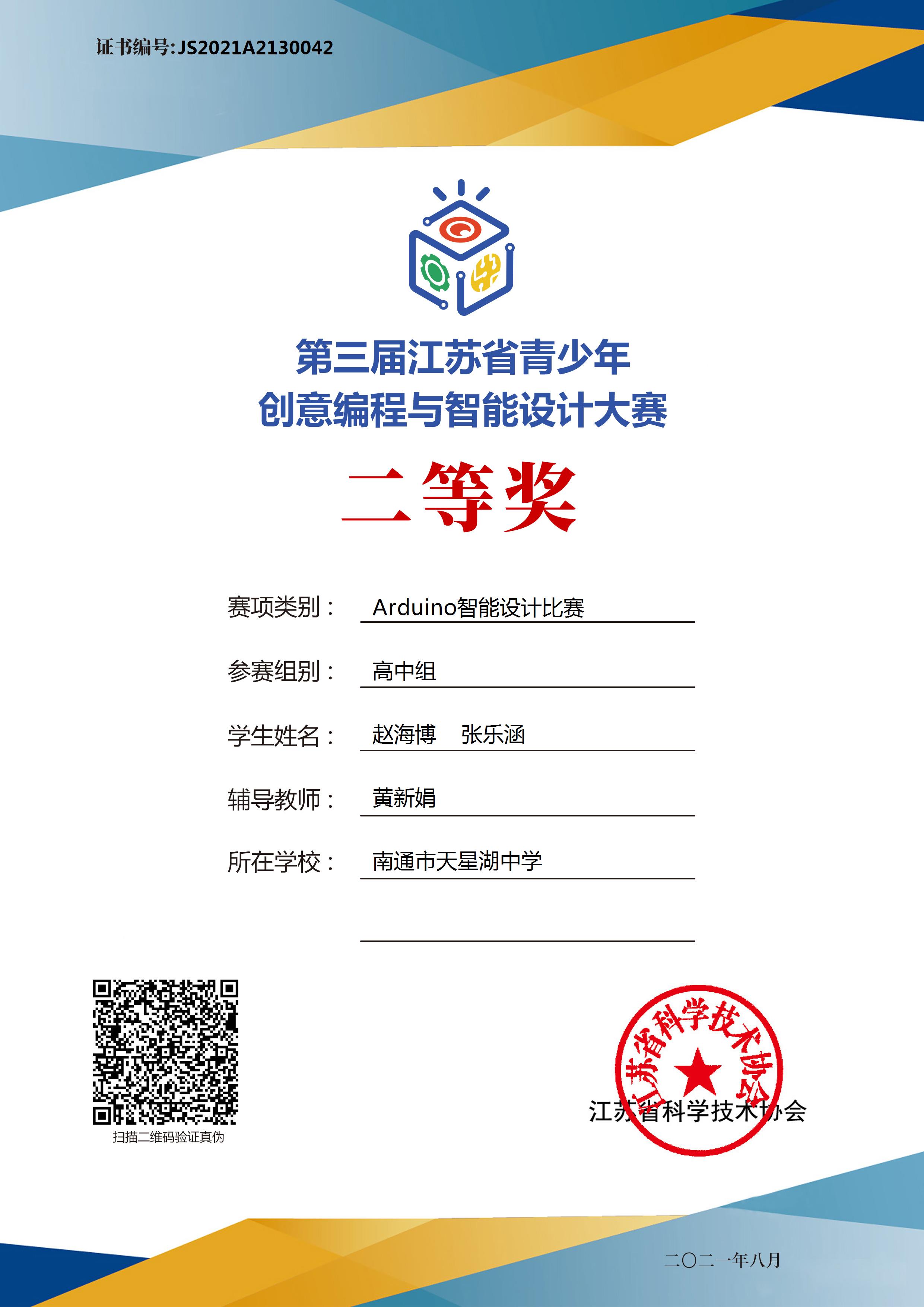 我校学生赵海博、张乐涵在高中组Arduino智能设计比赛中,获省二等奖。我校信息学科备课组黄新娟老师给予了两位学生全程辅导。