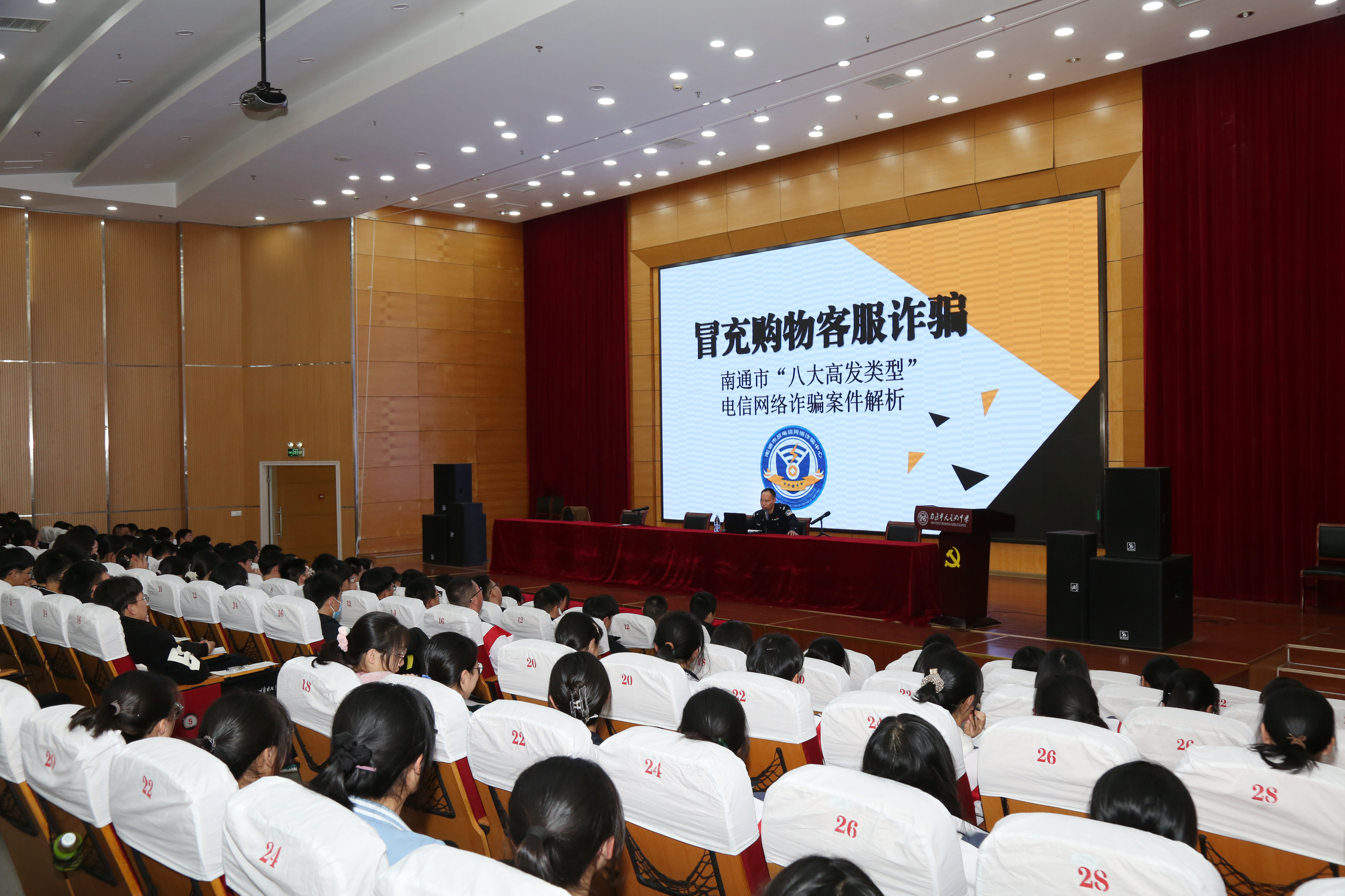 近年来,社会上诈骗案件频发,为有效遏制利用电信和互联网渠道实施诈骗犯罪活动的上升势头,提高青少年学生对电信诈骗手法的识别和防范能力,11月15日下午,我校道德法治讲坛暨青年团课如期开展。法治副校长、南通市公安局开发区分局新开派出所曹均阳警官走进校园,开展预防电信诈骗宣传活动。