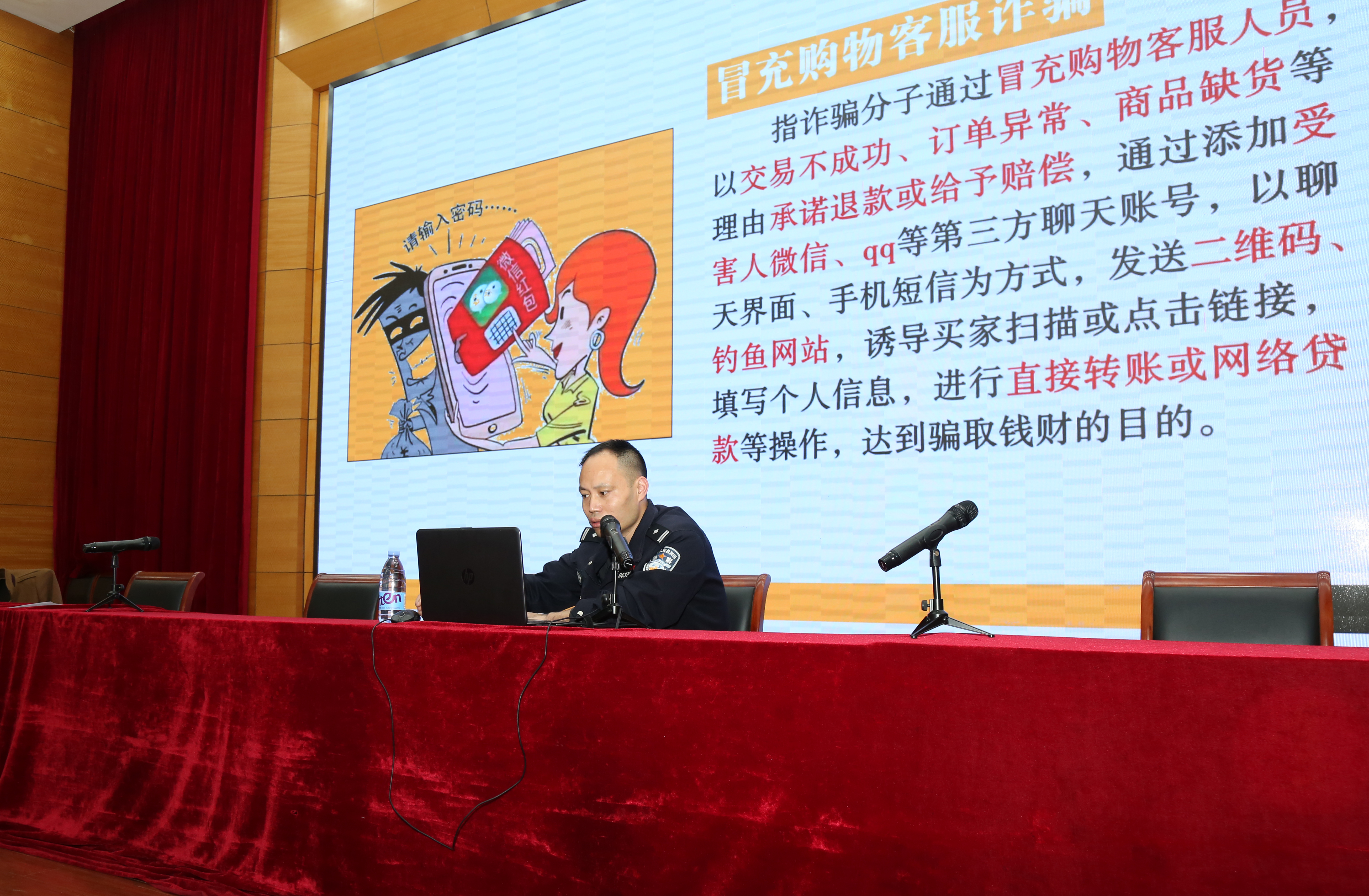 活动中,曹警官给同学们介绍了 “冒充购物客服诈骗”、“冒充公检法诈骗”、“网络兼职刷单诈骗”、“虚假购物服务诈骗”等我市“八大高发类型”电信网络诈骗案例,分析了这些案件的特点,阐述了案件发生的原因,从诈骗犯的犯罪手段、受骗人的心理及校园案件的特点出发,提醒同学们要提高警惕、提高预防能力。