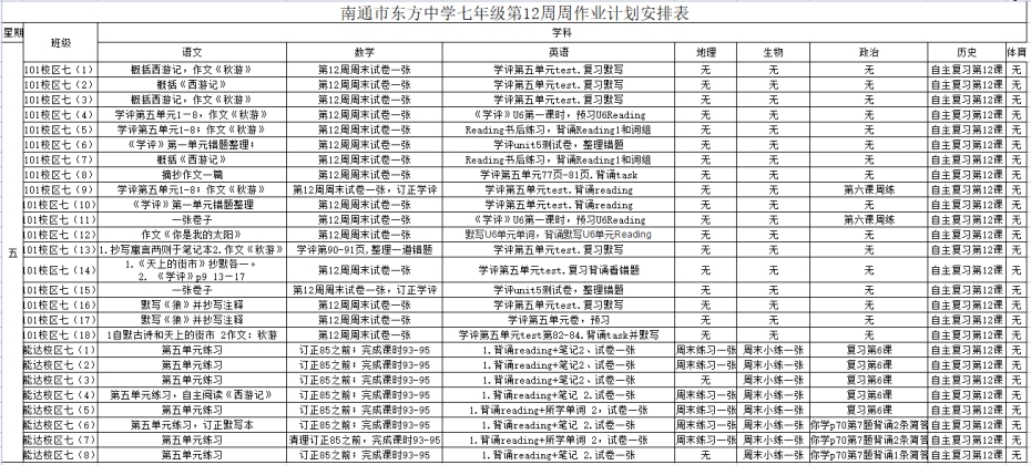 南通市东方中学初三周课时、周作业计划表(第九、第十周)