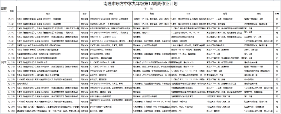 南通市东方中学九年级各班各科周作业公示表