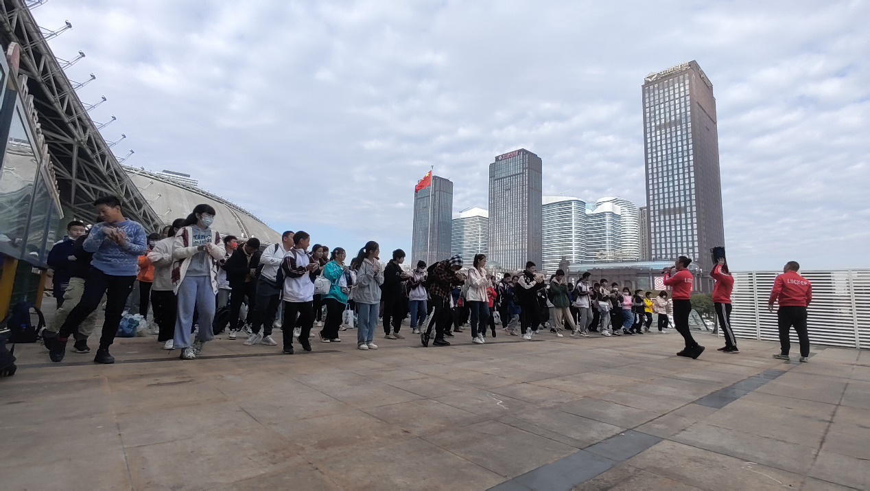 在正式进入主题乐园前,学生们在教练的带领下开始热身,舒展身体才能在接下来的游戏中尽情发挥!