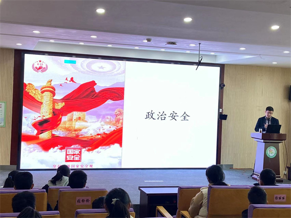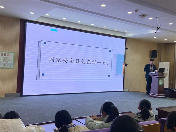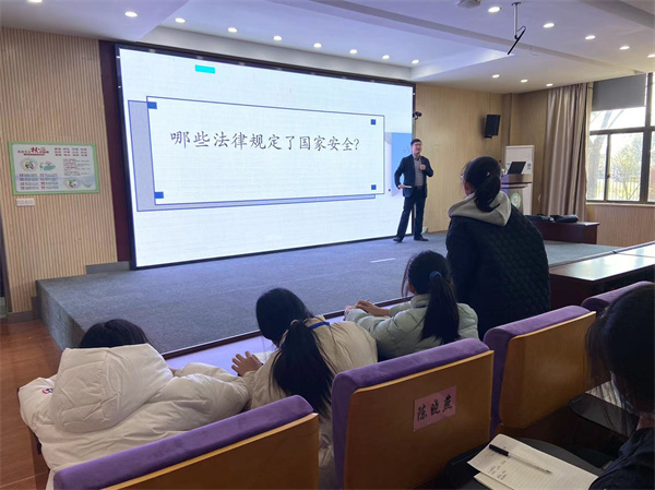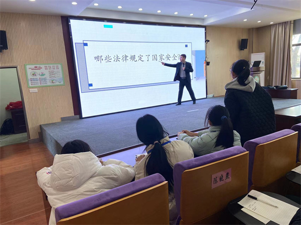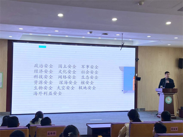 陈校长首先选取了有关政治安全、社会安全、公共卫生安全、生物安全的具体事例,深入浅出地给同学们讲解了什么是安全法相关知识。接着他通过对几个条例解读,警醒同学们在生活中提高安全意识。紧接着,陈校长用生活中的热点问题,强调当今学校教育中加入法治教育刻不容缓。最后,他希望同学们努力做到保持警惕,自觉抵御腐蚀诱惑,敢于和损害国家的言论和行为作斗争。生动的讲解中,穿插着法律知识问答,大大激发了同学们的兴趣,增强了相关法律知识,提升了同学们的法律意识。