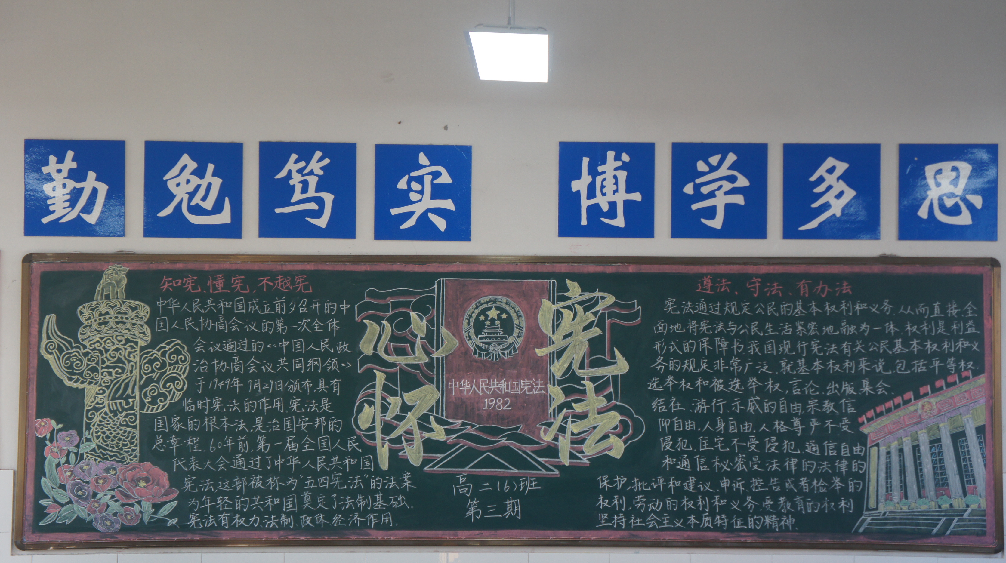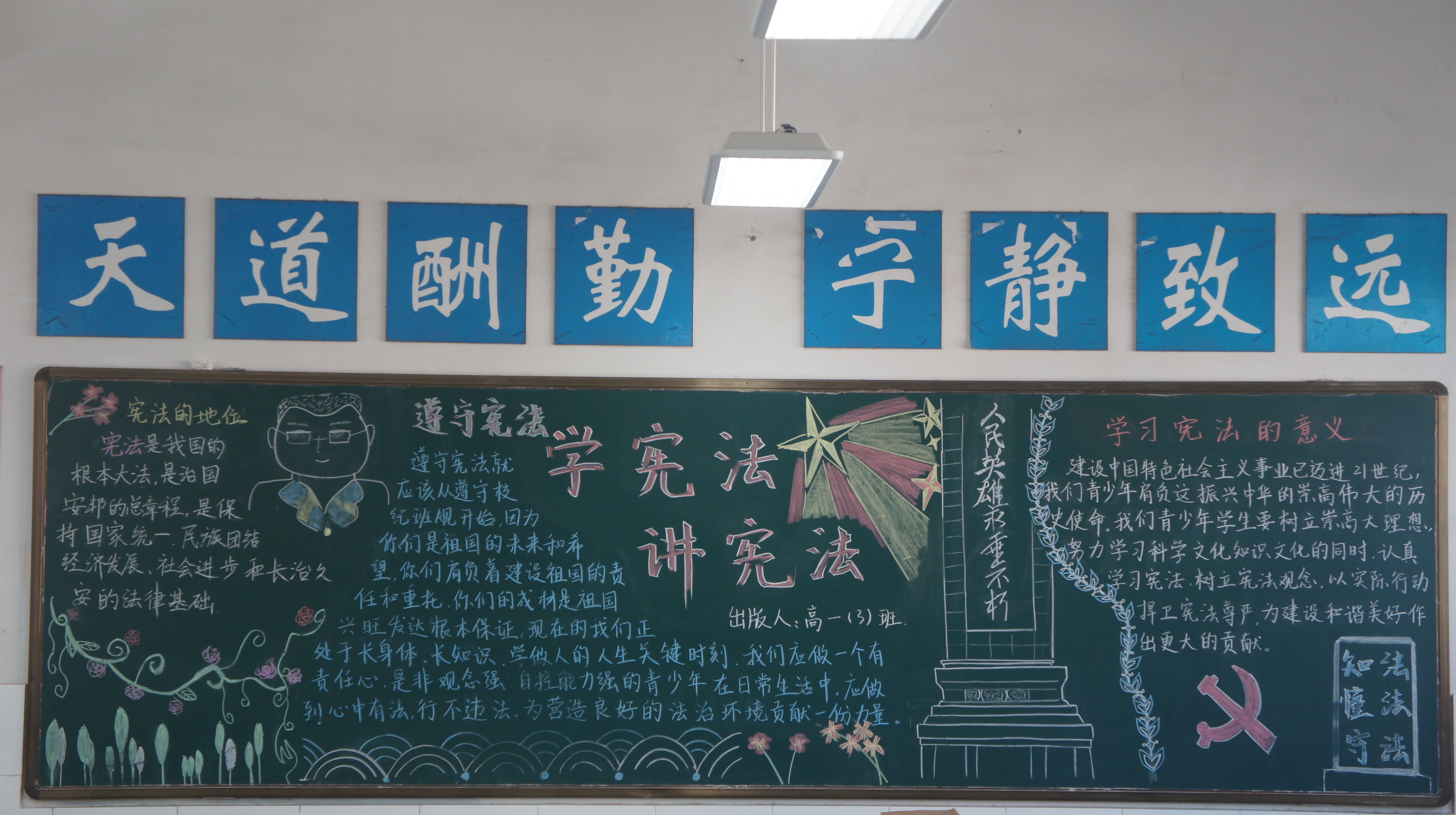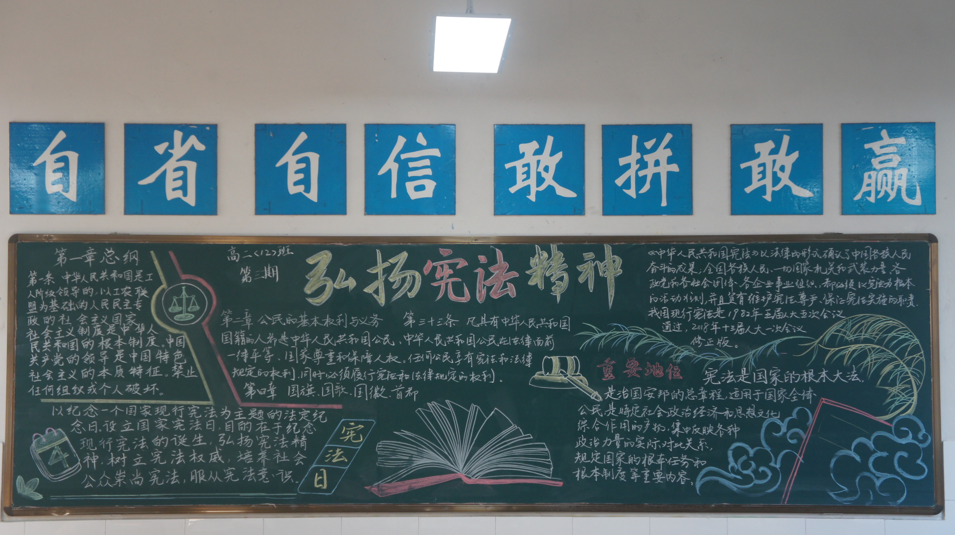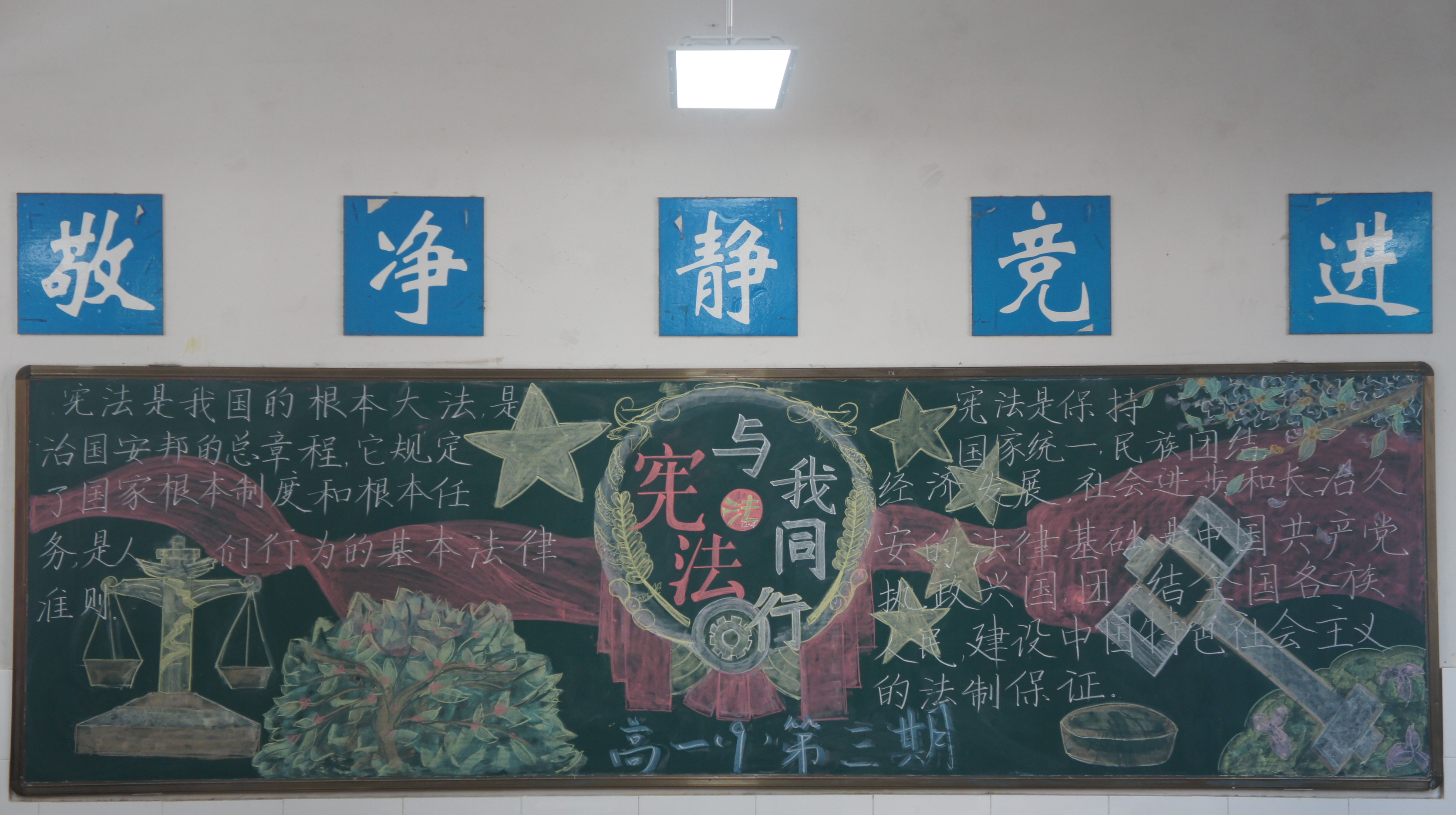 宪法是国家的根本大法,是治国安邦的总章程。为宣传国家宪法日主题教育,我校组织了一系列“学宪法 讲宪法”教育活动。我校团委联合学生处,对高一、高二年级组织开展了“学宪法 讲宪法”黑板报主题评比活动。