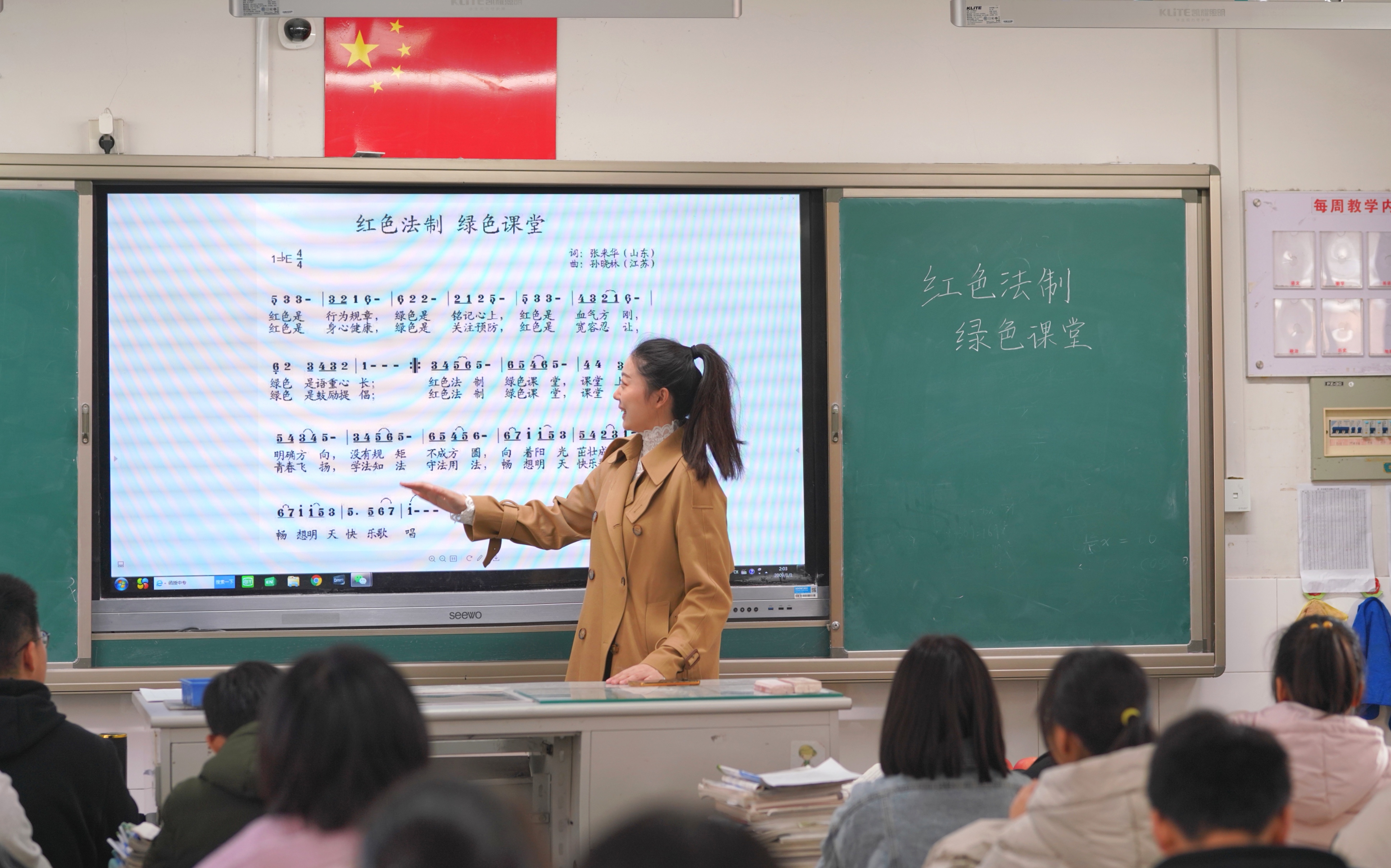 音乐组教师精心准备《红色法制 绿色课堂》一歌作为教学内容。经过对法治歌曲的学习和演唱,同学们感受到了宪法精神,体会到了法治力量,将宪法的精神内化于心,外化于行。此次活动,增强了学生的法律意识,培养了学生对宪法的认同感,营造了人人遵守宪法、学习宪法的良好氛围。