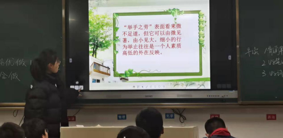 本次班会课让每个同学明白了举手之劳是每个社会人的责任。聚沙成塔,积土成山。这种习惯一旦养成就会焕发光彩。让举手之劳成为一种美德,在生活的朴实中彰显礼仪风范,让道德的芬芳溢满心间,做东中文明好少年。