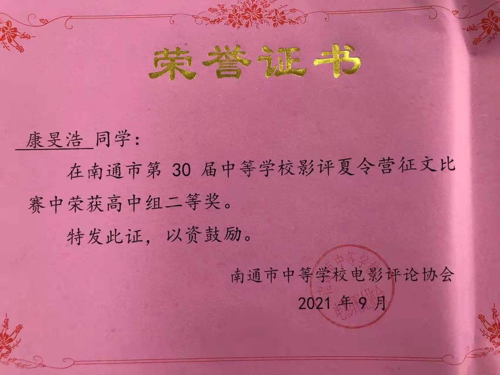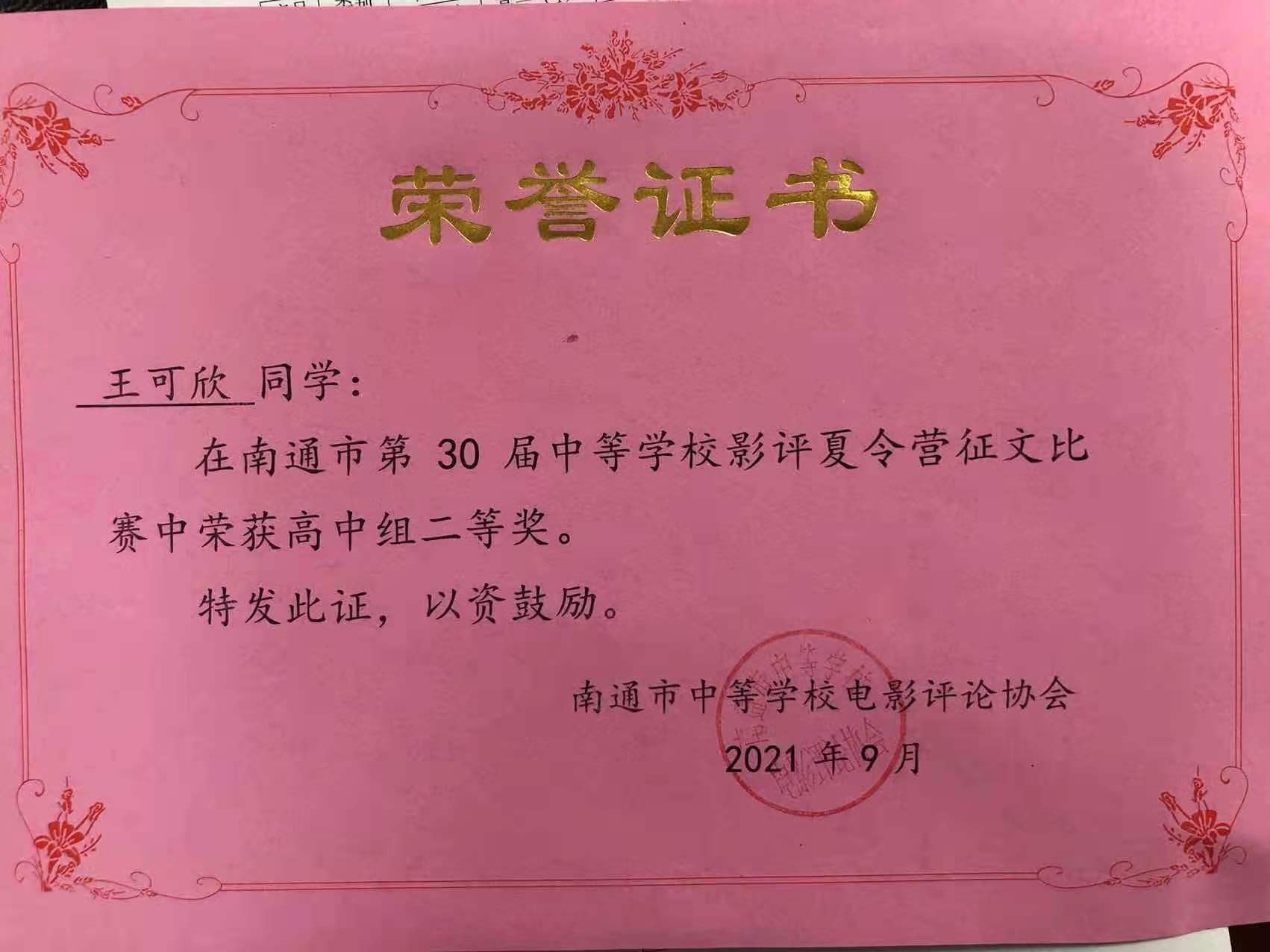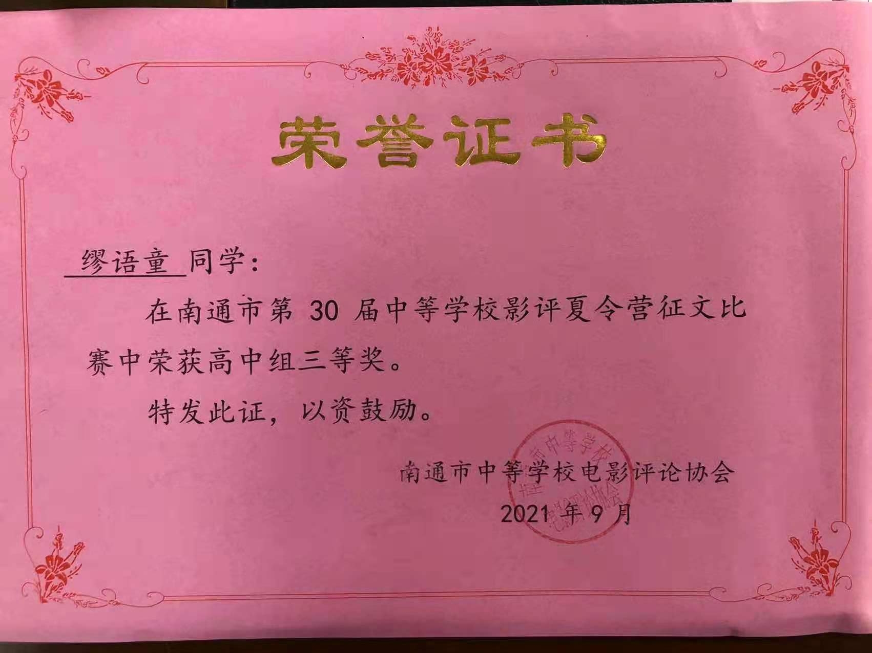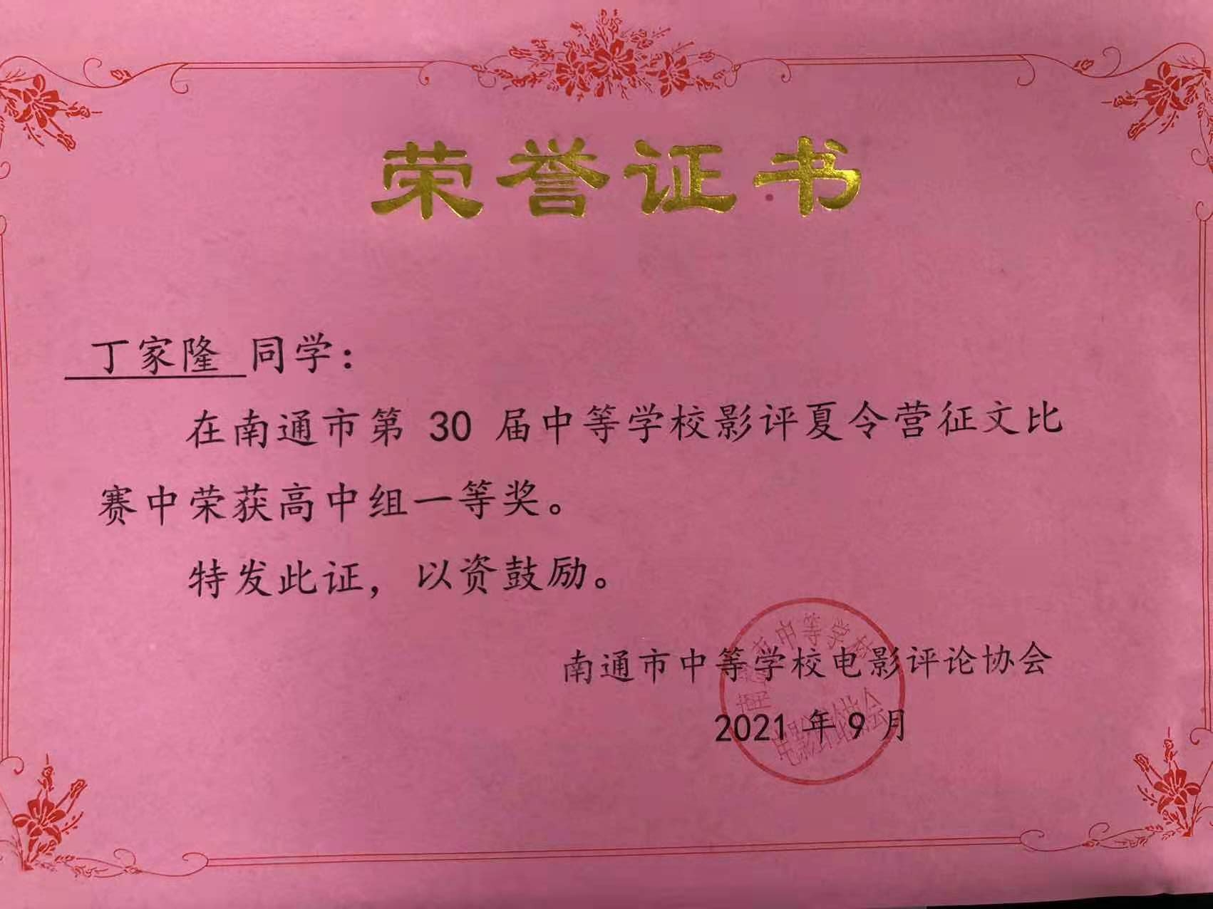 在征文比赛中,我校丁家隆同学获高中组一等奖,康旻浩、王可欣同学获高中组二等奖,缪语童同学获高中组三等奖,朱苏燕老师被授予“优秀指导教师”称号。