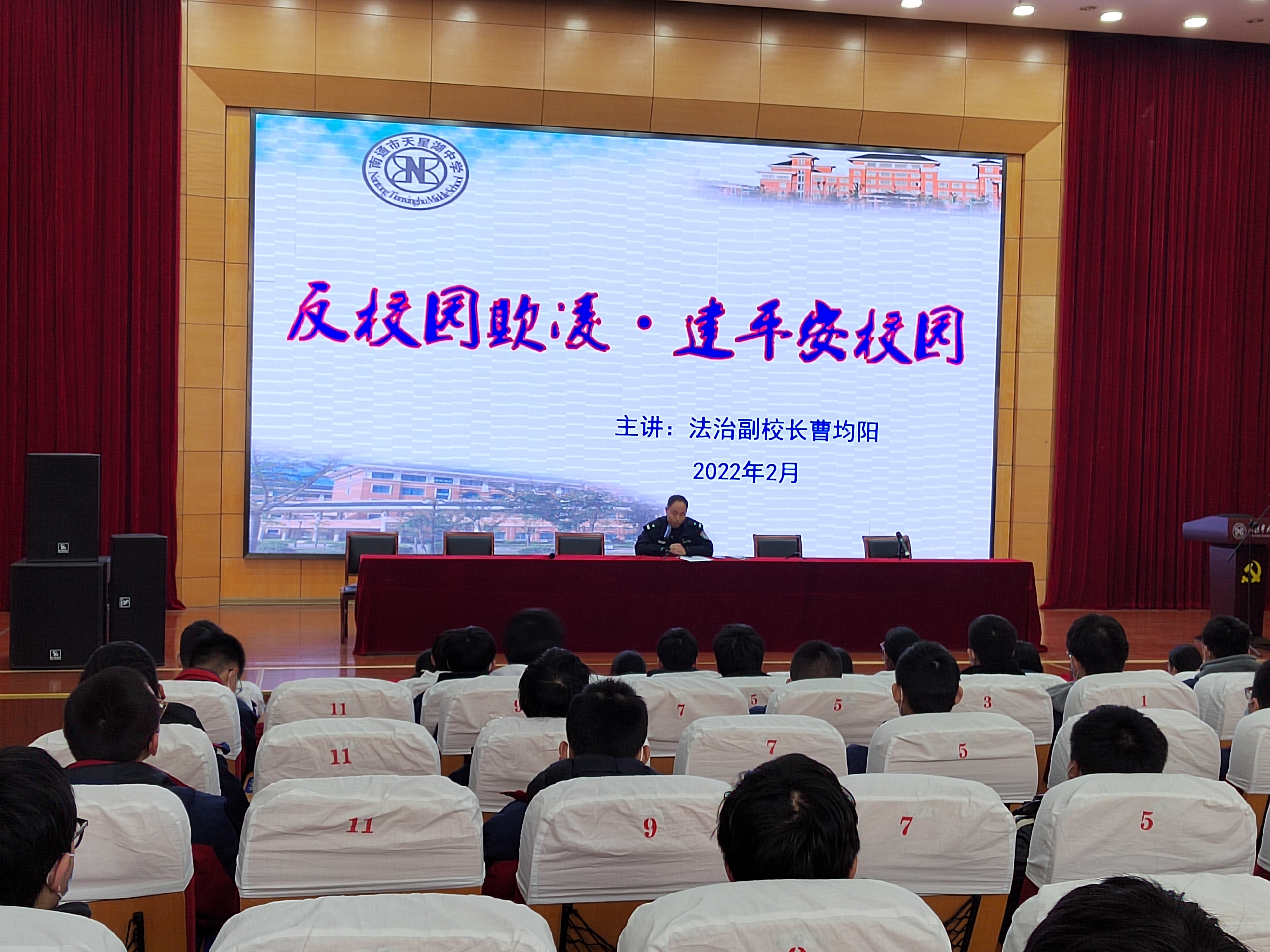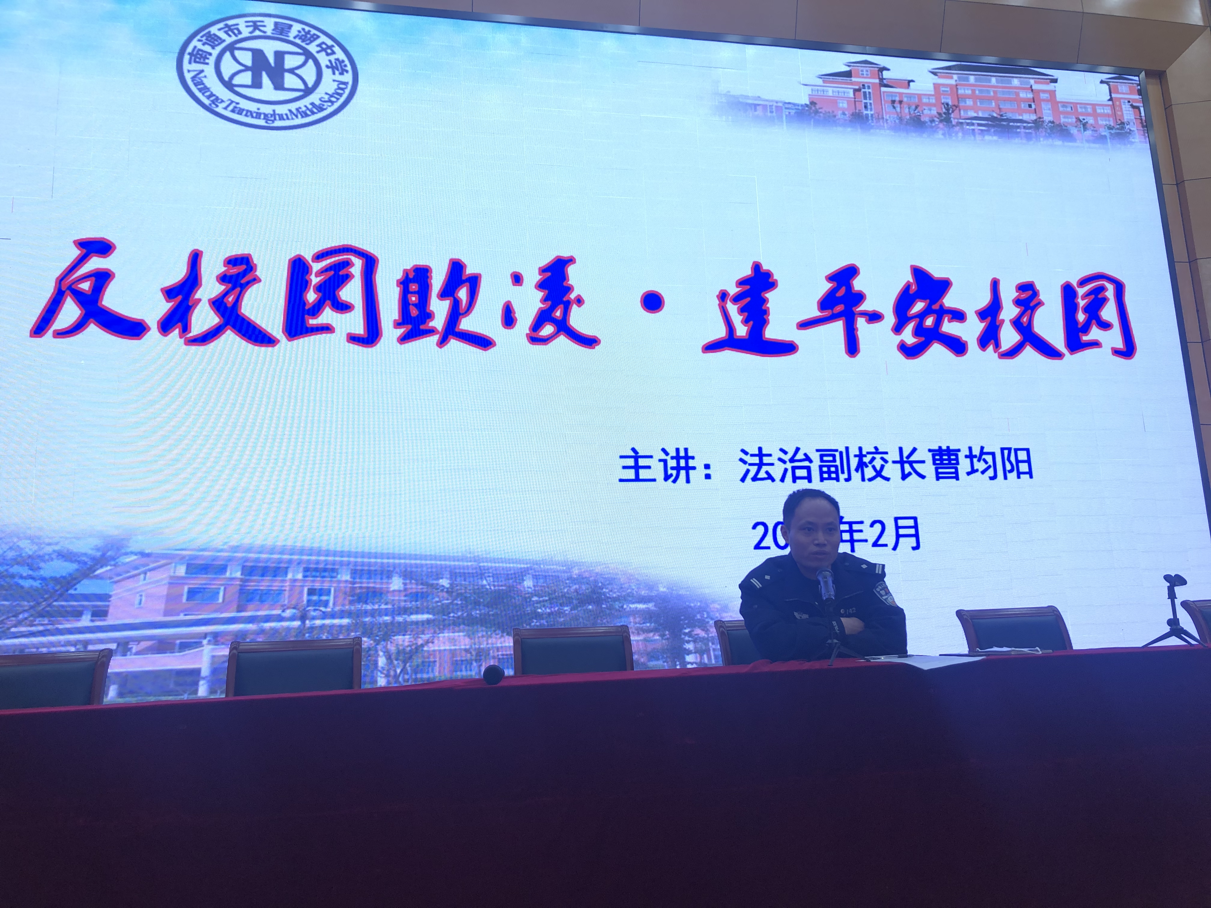 校园欺凌不仅会在身体上影响被欺凌人的健康,还会在心理上给被欺凌人以巨大的、长期的损害,这种伤害将深埋于被欺凌人的内心,终生难忘。为坚决杜绝此类事件发生,2月22日下午,我校法治副校长、南通开发区公安分局新开派出所曹均阳警官亲临学校,在滋兰楼报告厅向同学们开设“反校园欺凌,建平安校园”法治教育讲座,学生处主任曹俊飞主持本次讲座。