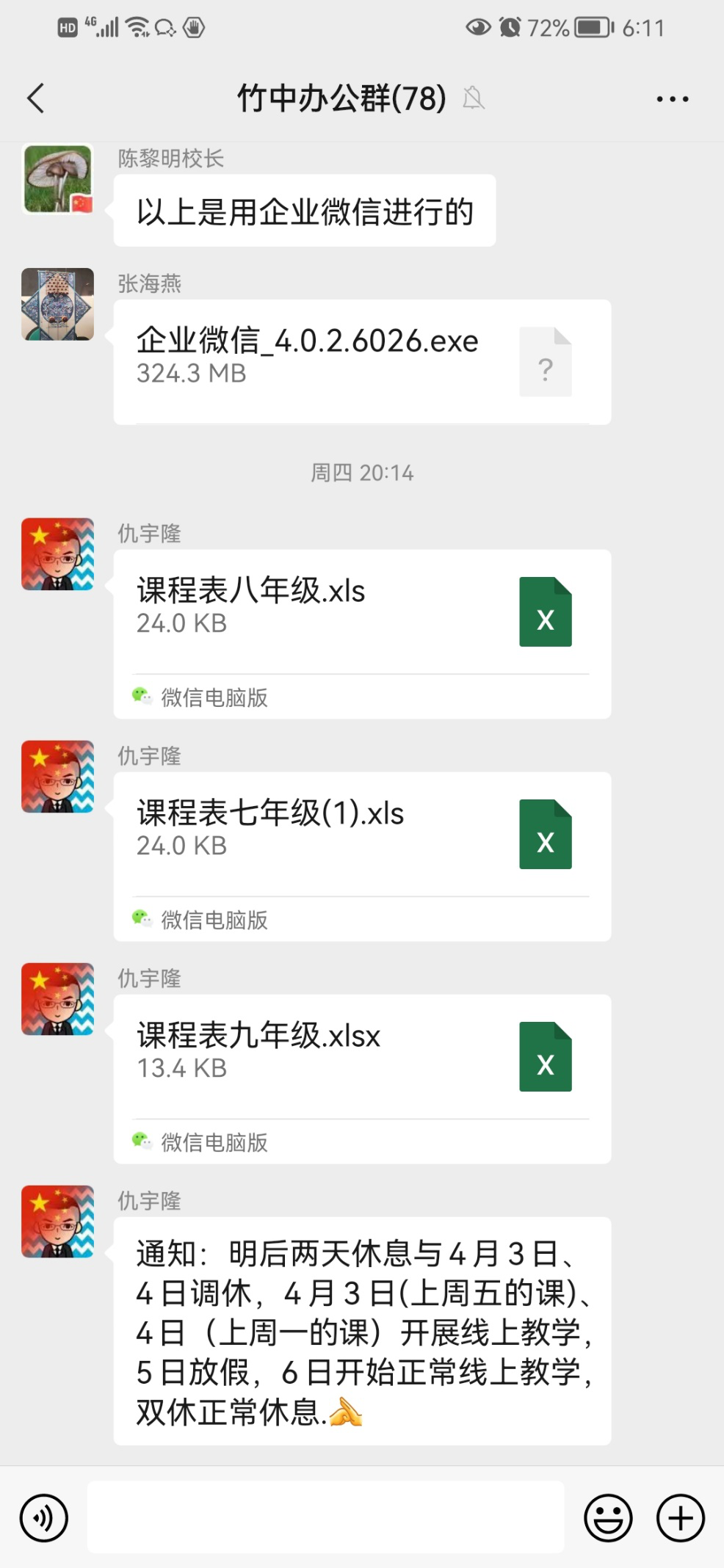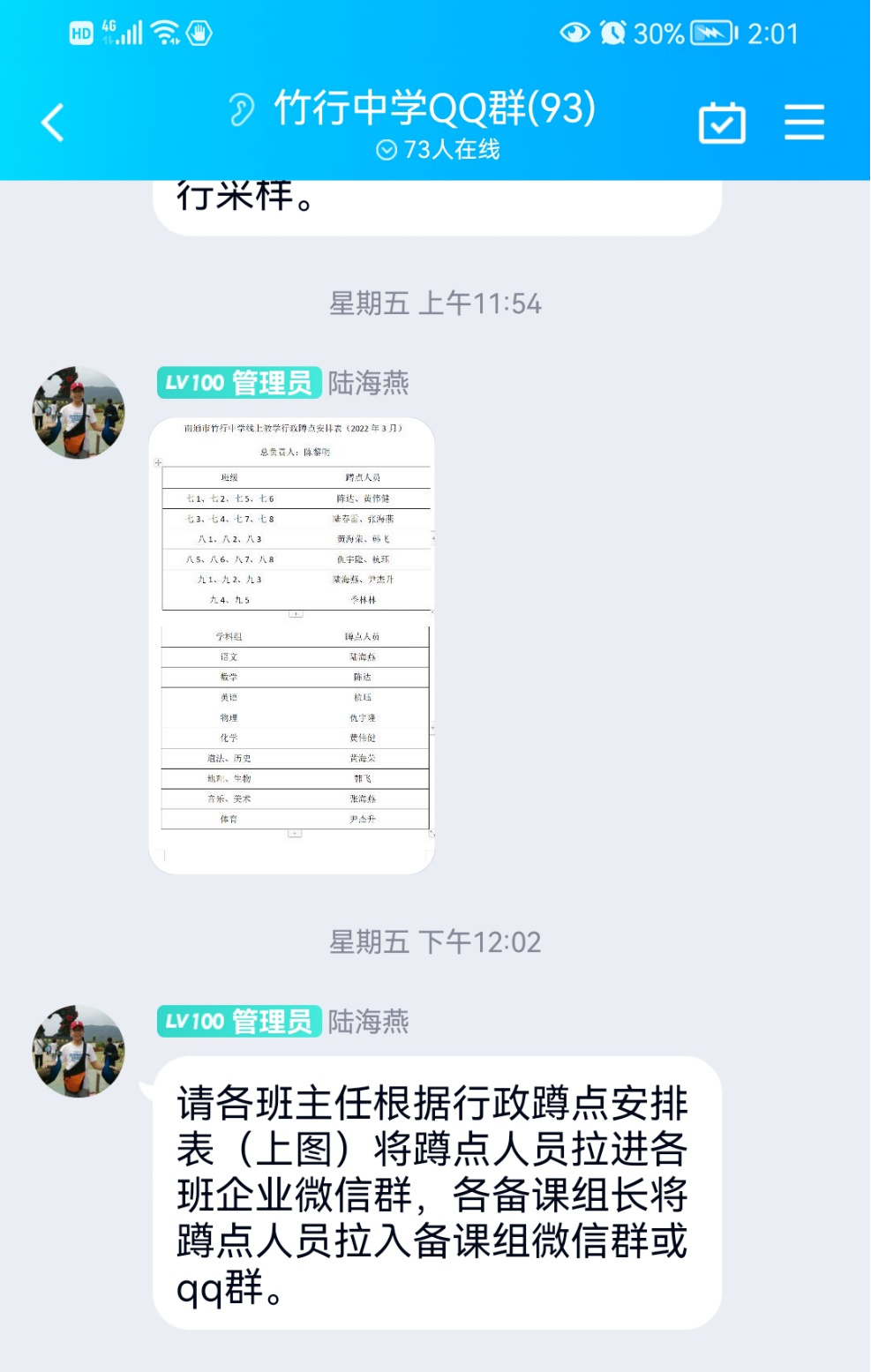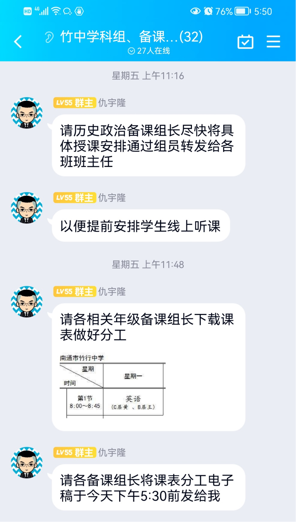 3月31日“南通市疫情防控2022年第24号通告”要求:市区所有中小学校停止线下教学,改为线上教学。接到通知以后,南通市竹行中学校长室立即召集全体行政人员、全体班主任、全体备课组长全面部署错峰放学和线上教学工作会议,会上落实多项举措,旨在筑牢线上教学质量防线。