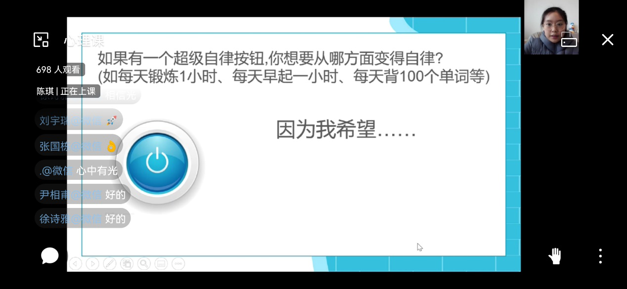 我校线上教学作息时间安排表中上、下午都安排了体育锻炼时间,同学们在体育老师的指导下按时锻炼,学习健身两不误。不少同学哈积极主动帮家长分担家务事。学校心理老师陈琪老师专门为全校同学开设心理课《让自律成为生活规律》,指导同学们怎样居家自律学习。