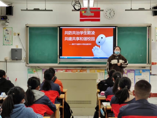 班会课上,班主任首先播放动画短片,让学生认识到一些常见的校园欺凌现象:肢体欺凌、言语欺凌、社交欺凌和网络欺凌;接着明确欺凌者、受害者、围观者三者的区别,最后告诉学生应对校园欺凌的方法。一旦遇到欺凌,要立刻报告老师、家长,甚至寻求警察的帮助。