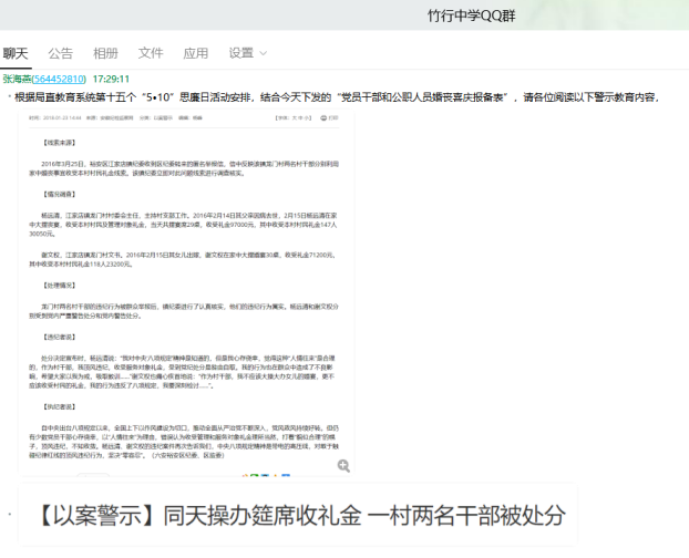5月11日,结合上级部门下发的党员干部和公职人员婚丧喜庆事项报备的要求,学校纪检委员以《同天操办筵席收礼金 一村两名干部被处分》开展以案警示教育,要求全体公职人员以案为镜,对照检查,做到防微杜渐,警钟长鸣。