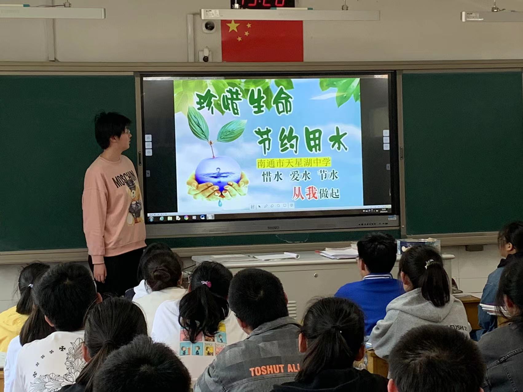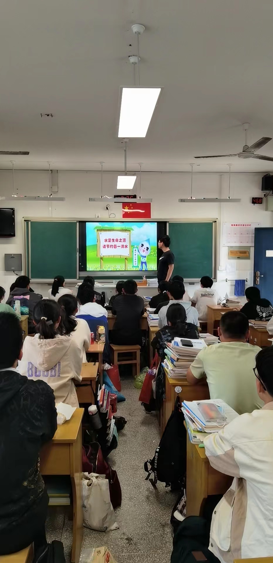各班利用多媒体设备开展了主题班会。在主题班会中,学生通过一张张图片、一段段新闻报道、一串串数字,了解了目前世界水资源的分布情况和水资源匮乏地区的现状。节约用水,刻不容缓的念头在学生心中油然而生,大家踊跃发言、集思广益,为节约用水献计献策。