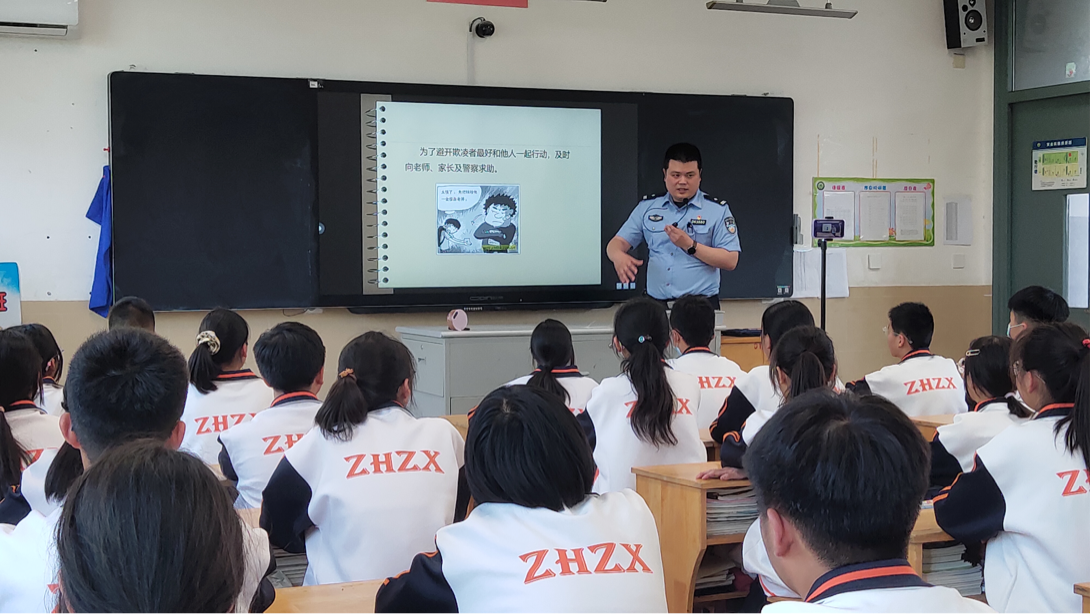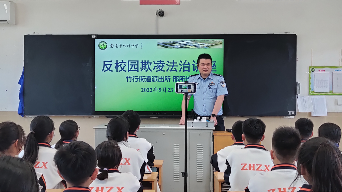 为进一步提高学生的自觉守法意识和自我保护意识,有效预防校园欺凌事件,5月23日下午,竹行中学法治副校长、竹行街道派出所邢所长为我校初一、初二学生开设了一场以“反校园欺凌”为主题的法治讲座。