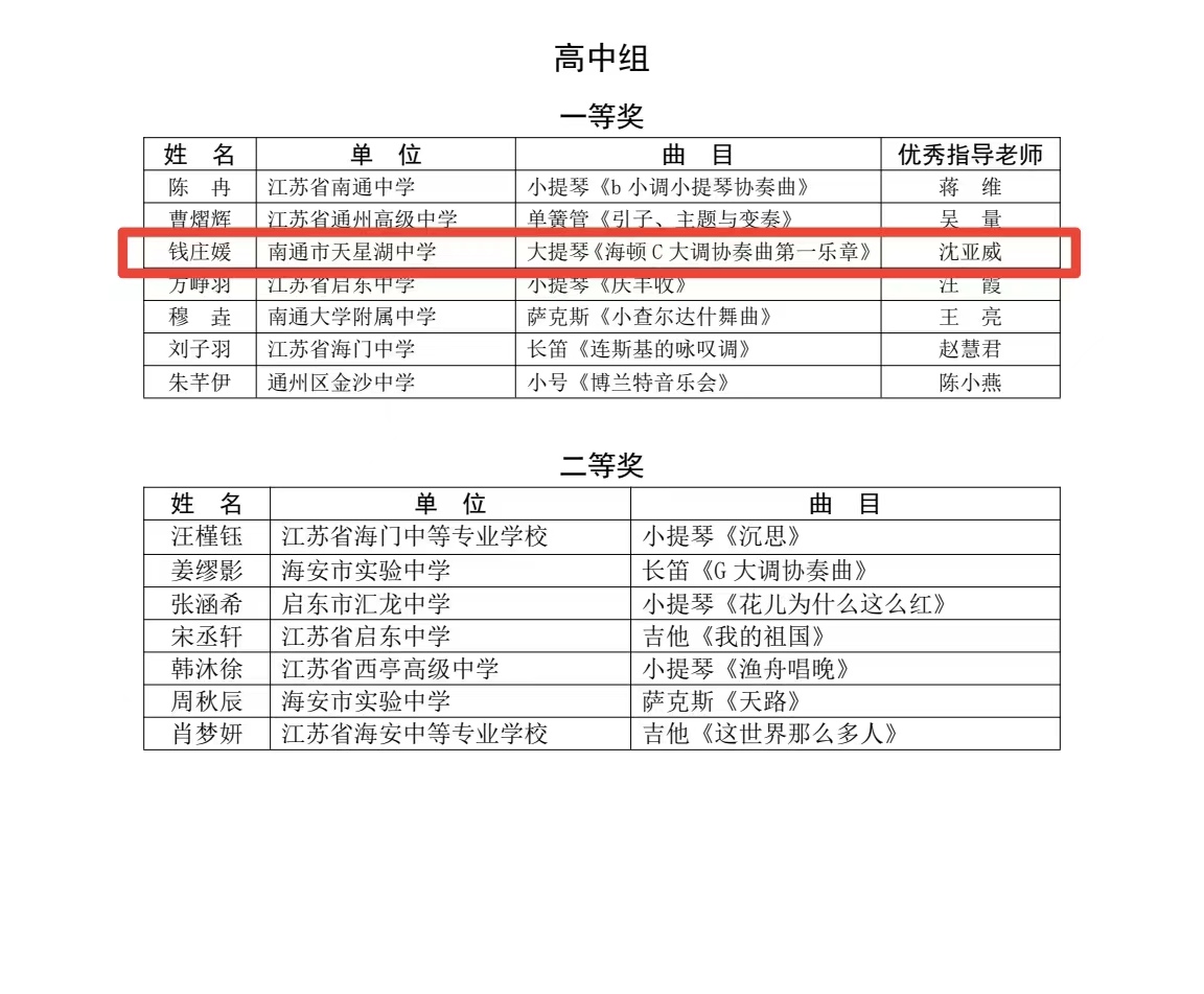 我校钱庄媛、陈长泓同学参加比赛。最终,钱庄媛同学演奏的大提琴曲《海顿C大调协奏曲第一乐章》获独奏(西洋乐器:拉弦、吹奏乐器)一等奖,陈长泓同学演奏的竹笛《塞上铁骑》获独奏(民族乐器:拉弦、吹奏乐器)二等奖。