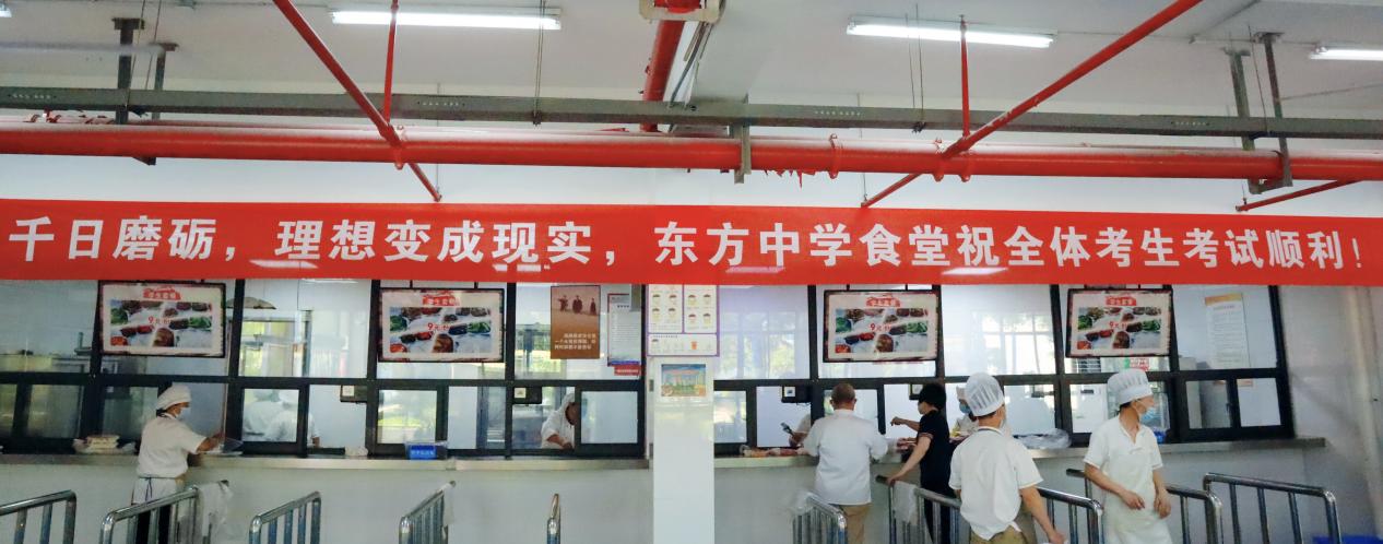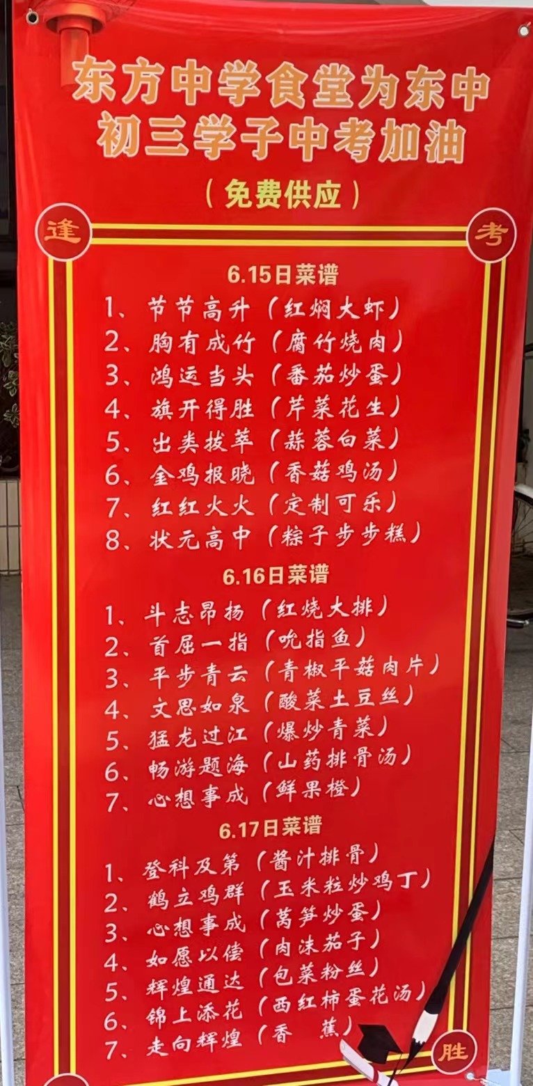面对中考,后勤部门发扬创新精神,“各显神通”。从特色菜谱制定、加油口号标语、服务安排优先、定制寓意食品等方面表达了对中考学子的深深祝福,希望爱心能量菜谱,能助力中考,“吃”出好成绩。