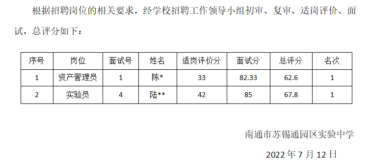 南通市苏锡通园区实验中学2022年公开招聘政府购买服务岗位工作人员成绩公示