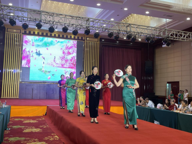 7月11日上午,2022年南通市老年人气排球、健身球、柔力球、旗袍秀、棋类联赛在美丽的如皋市长江镇金岛生态园举行,来自各县(市)区的11支中老年旗袍团队参加了联谊表演。