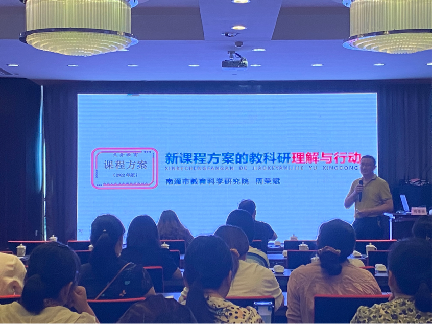 最后一站,教师们认真聆听了南通市教育科学研究院周荣斌教授以《新课程方案的教科研理解与行动》为题的讲座,周教授详细阐述了新课标以及双减背景下的课堂改革要求与教科研活动实践,并以幽默风趣的语言风格对课程内容的革新、课程评价方式的多样、跨学科主题的学习、项目化学习的尝试等进行了深入浅出的诠释。讲座过程中,依据教育方针政策以及目前的教育教学生态,教师们与周教授开展了热情洋溢的讨论,会场气氛活跃又融洽。