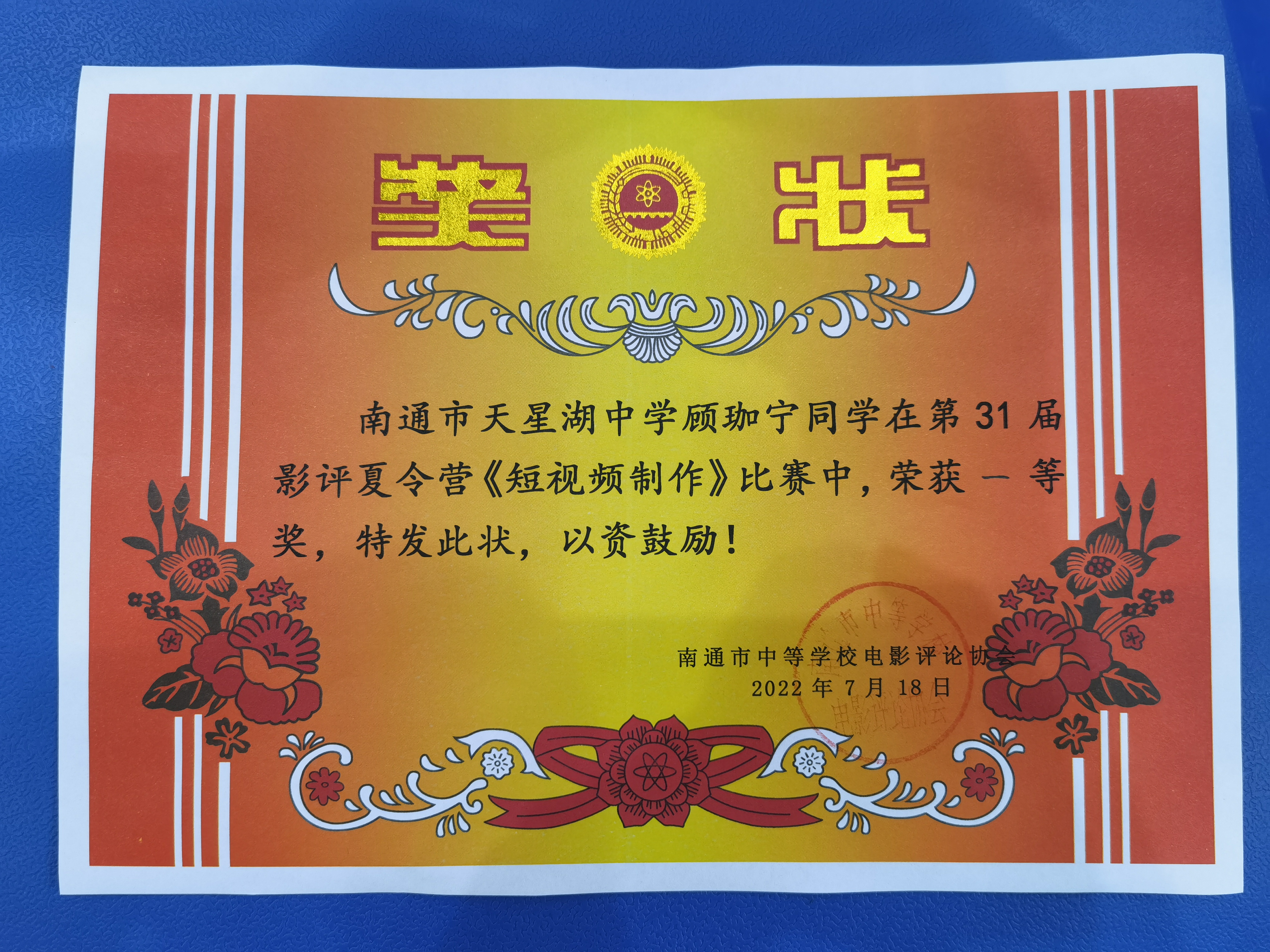 7月18日、19日,南通市第31届中等学校电影评论协会夏令营在南通市启秀中学举行。我校顾珈宁、虞溢文、屈小雅、邢抒、袁迦叶五位同学参加了本次活动。