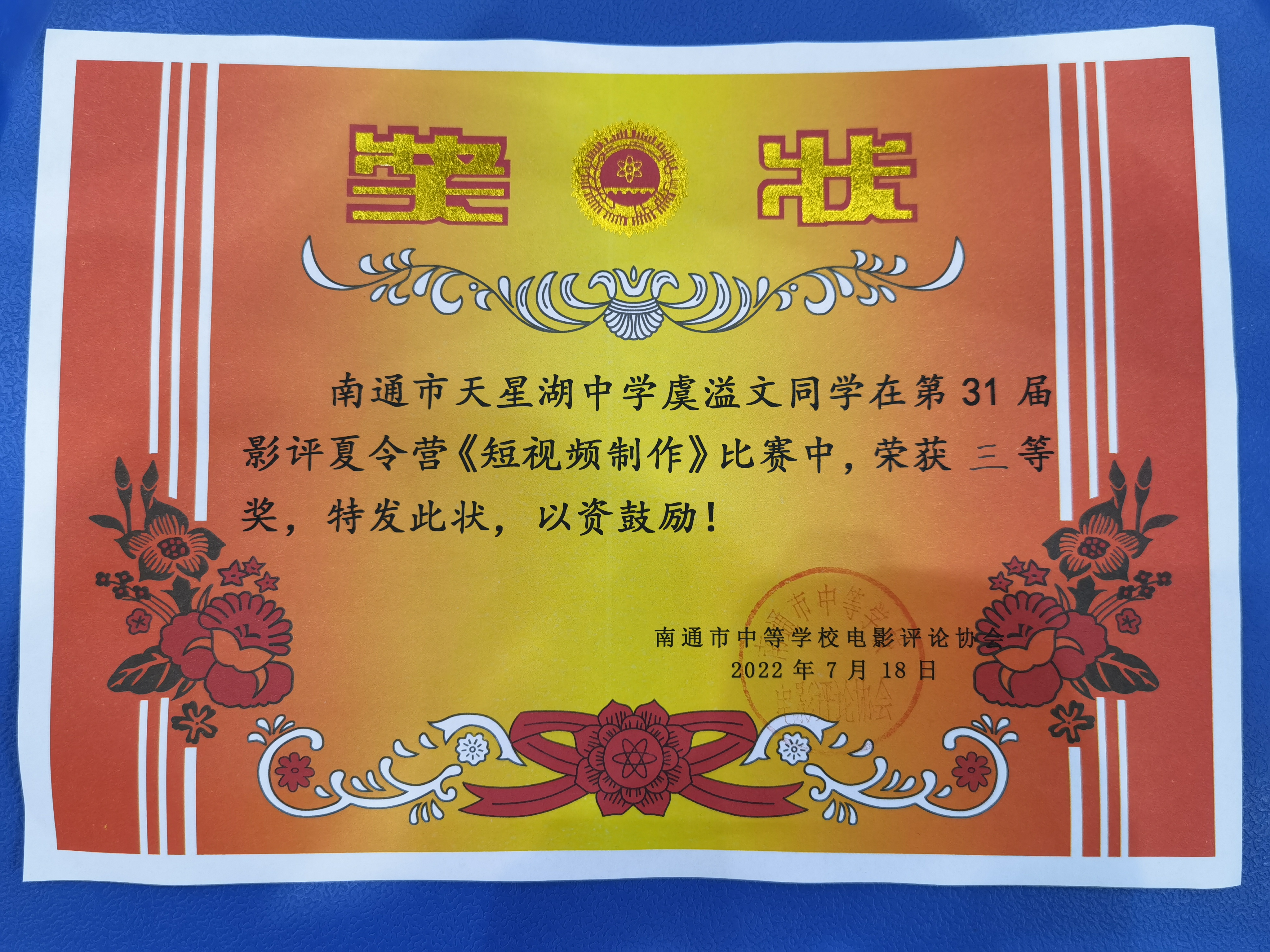 我校学子在31届南通市中影会夏令营短视频制作比赛中获奖