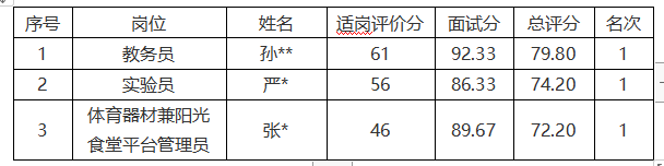 根据招聘岗位的相关要求,经学校招聘工作领导小组初审、复审、适岗评价、面试,总评分如下: