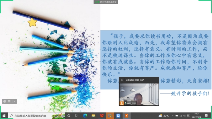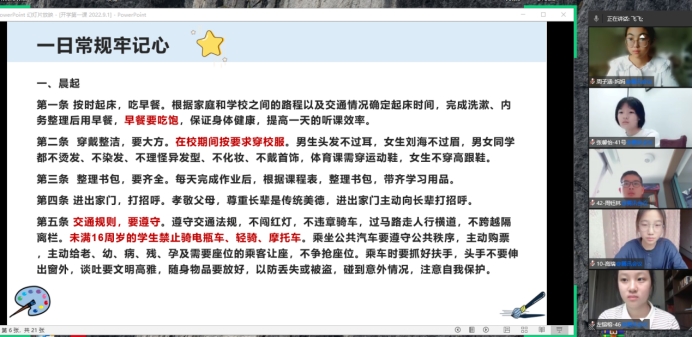 为了帮助孩子们尽快从假期状态转入上学状态,养成良好的生活习惯,开学首日,各年级班主任精心开设了线上开学第一课。各班主任围绕习惯养成、日常规范、疫情防控、安全教育、心理健康等,开展了多项专题教育活动。叮嘱同学们要强化防疫、安全等意识,严格按照作息时间做好居家线上学习,规范做好防疫要求,以良好的状态迎接线下校园生活。