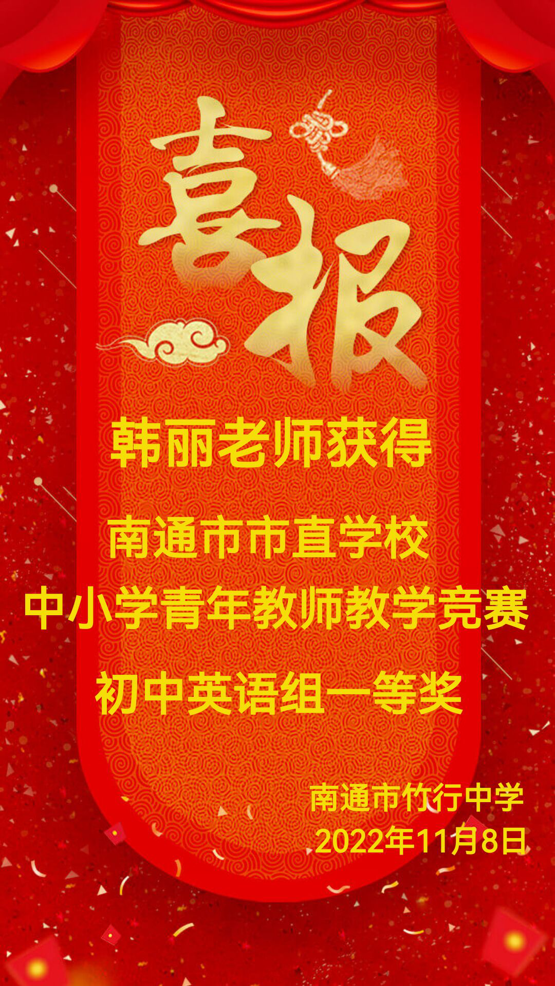 【竹行教育·喜报】我校韩丽老师荣获南通市直学校中小学青年教师教学竞赛一等奖