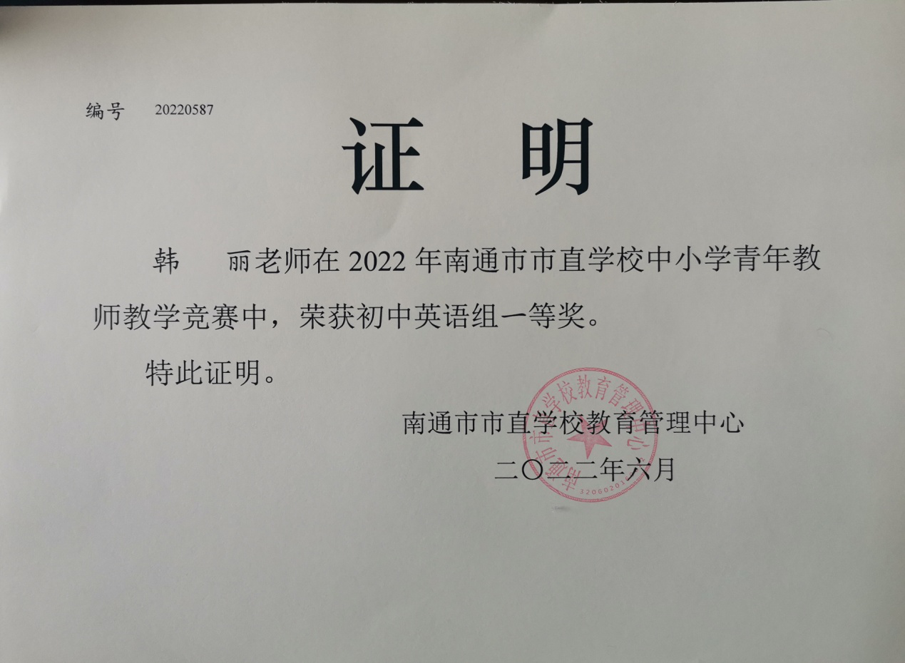 我校韩丽老师在2022年南通市市直学校中小学青年教师教学竞赛中,荣获初中英语组一等奖。