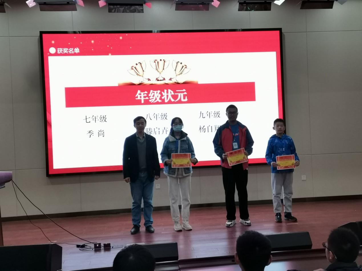 首先由教务处仇主任宣布被表彰的优秀学生名单。陈黎明校长和陆海燕副校长为年级状元、各年级的“五星级学习之星”、“ 四星级学习之星”和“三星级学习之星”颁发奖状。