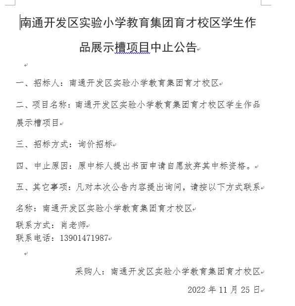 南通开发区实小教育集团育才校区学生作品展示槽项目中止公告