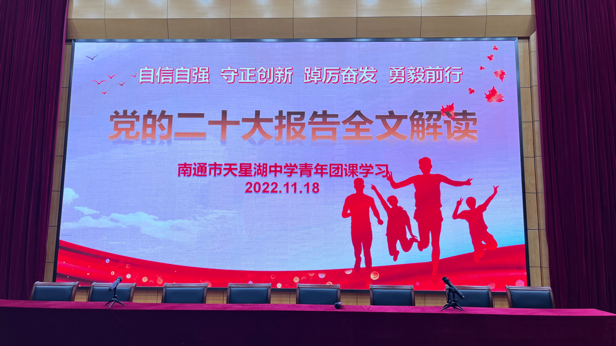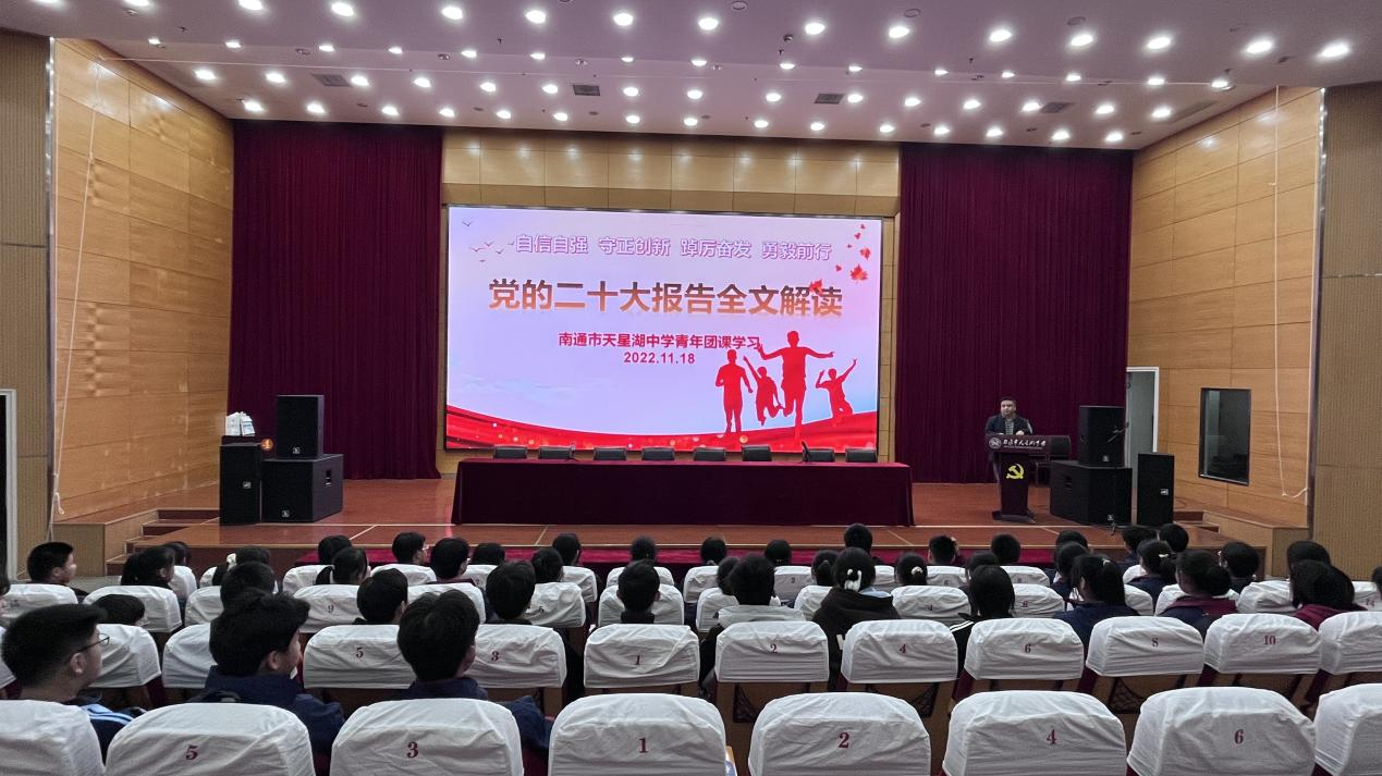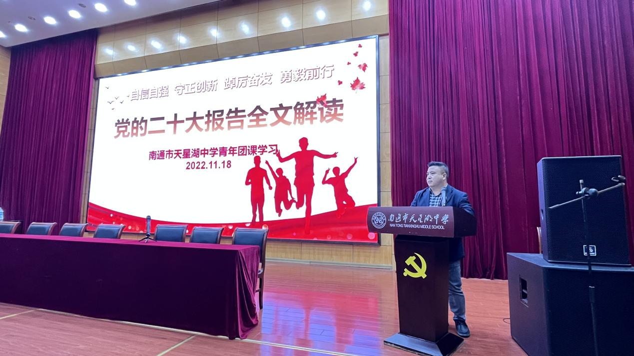 中国共产党第二十次全国代表大会已经胜利闭幕,为深入学习宣传贯彻党的二十大精神,引导全体学生厚植爱党爱国的情怀,更好地团结引领广大青少年紧跟党奋进新征程、夺取新胜利,培养担当民族复兴大任的精神,11月18日,南通市天星湖中学校团委组织团支部书记及入团积极分子开展了“学习二十大精神,永远跟党走,奋进新征程”主题团课活动。